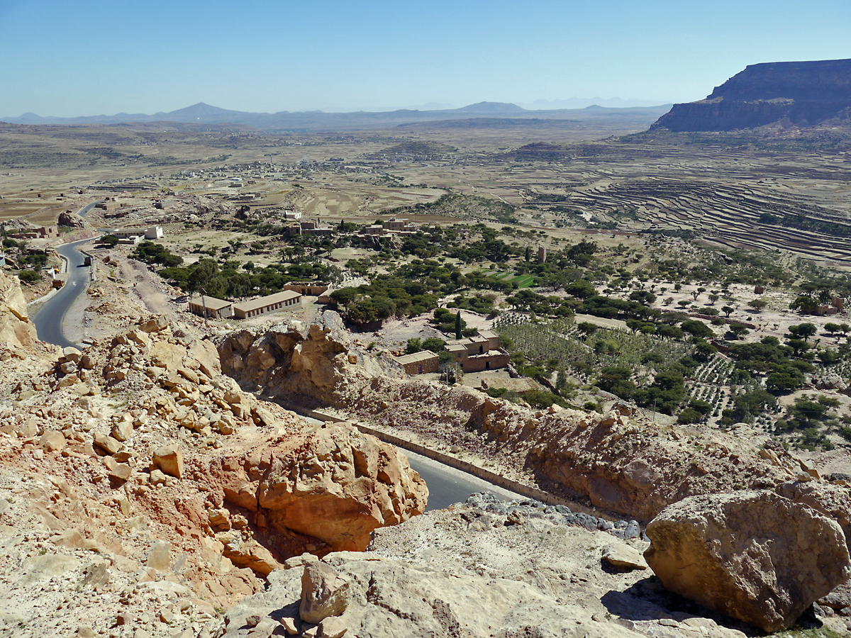 Vägen följde ofta den gamla, traditionella Kaffeleden och av och till syntes rester av utsiktstorn och caravaniserajer i ruiner, men utsikten torde vara med världens bästa! Av kriget såg vi inget här, men så fort vi lämnade asfalten, följde en urusel jordväg ned emot Khamis Bani Sa´d, så varenda människa vi passerade, och de var många, tiggde om hjälp, så uselt var livet. Ju längre ned, desto mörkare blev människorna och det kändes alltmer lätt afrikanskt. Och så plötsligt rullade vi in i området som kallades Tihama och temperaturen var stekhet. Här lärde jag mig hur generösa jemeniterna är, trots dålig ekonomi. Både Amin och Abdul Aziz gav dem småpengar, trots usel ekonomi, så jag lärde mig och hjälpte till. Man kan inte ge alla, men hjälpa en del.