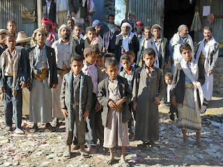 Så vi satte i stället full fart från byn, följde de stenigaste av vägar, torkan som präglade området kändes, hettan olidlig, men nästan hela tiden träffade vi på folk, mest barn och ungdomar på väg mot skolan, de äldsta bar Kalashnikov. I en by stannade vi till, jag kunde ha stannat flera dagar om inte tidspressen legat på, där folk kom man ur huse för att se oss och Antar. Som alltid ville de att jag skulle konvertera till islam, men när jag påpekade att det inte skulle ske idag och Amin skämtade att de bad mot Mecka och jag mot Aden, så skrattade de alltid. Proselyterande är ingen stor sak i Jemen, flertalet är inte alltför involverade i de religiösa aspekterna, även om de är stolta att vara muslimer. Mest pratade de om hur bortglömde de kände sig av de styrande. Det saknades kommunikation på alla nivåer, vatten, el och bra utbildning. Många av de skolor vi passerade, så bestod läraren av byns mest religiöse, imamen, som utbildade i islam, men knappt något annat och yttervärlden var i det närmaste okänd. Överallt var det skräpigt, främst i form av dessa eviga plastpåsar, som är den här världens otyg. Amin kallade det för den största av Jemens skatter!
