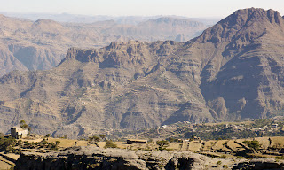 Plötsligt nådde vi toppen. Vilken lättnad. Utsikten norröver var än mer imponerande med berg över 3000 meter. Jag klappade Amin och Ahmed Ali på axlarna och gratulerade dem, lovade khat och en stor måltid när den möjligheten uppstod. Två Kalashnikov beväpnade bybor mötte oss, undrade vad vi ville och jag betalde av guiden, som fram tills dess varit underbar. Nu skrek han att han ville ha sin betalning och det berodde på att Amin sagt att jag filmade och han fick lägga manken till. Så kameran krånglade alltför ofta till hur människor bemötte oss. Oftast med stor nyfikenhet och önskan att få vara med på bild, men ibland, med hätskhet. Vilket jag märkte när vi kom till byn och jag gjorde misstaget att lite klumpigt filma kvinnor.