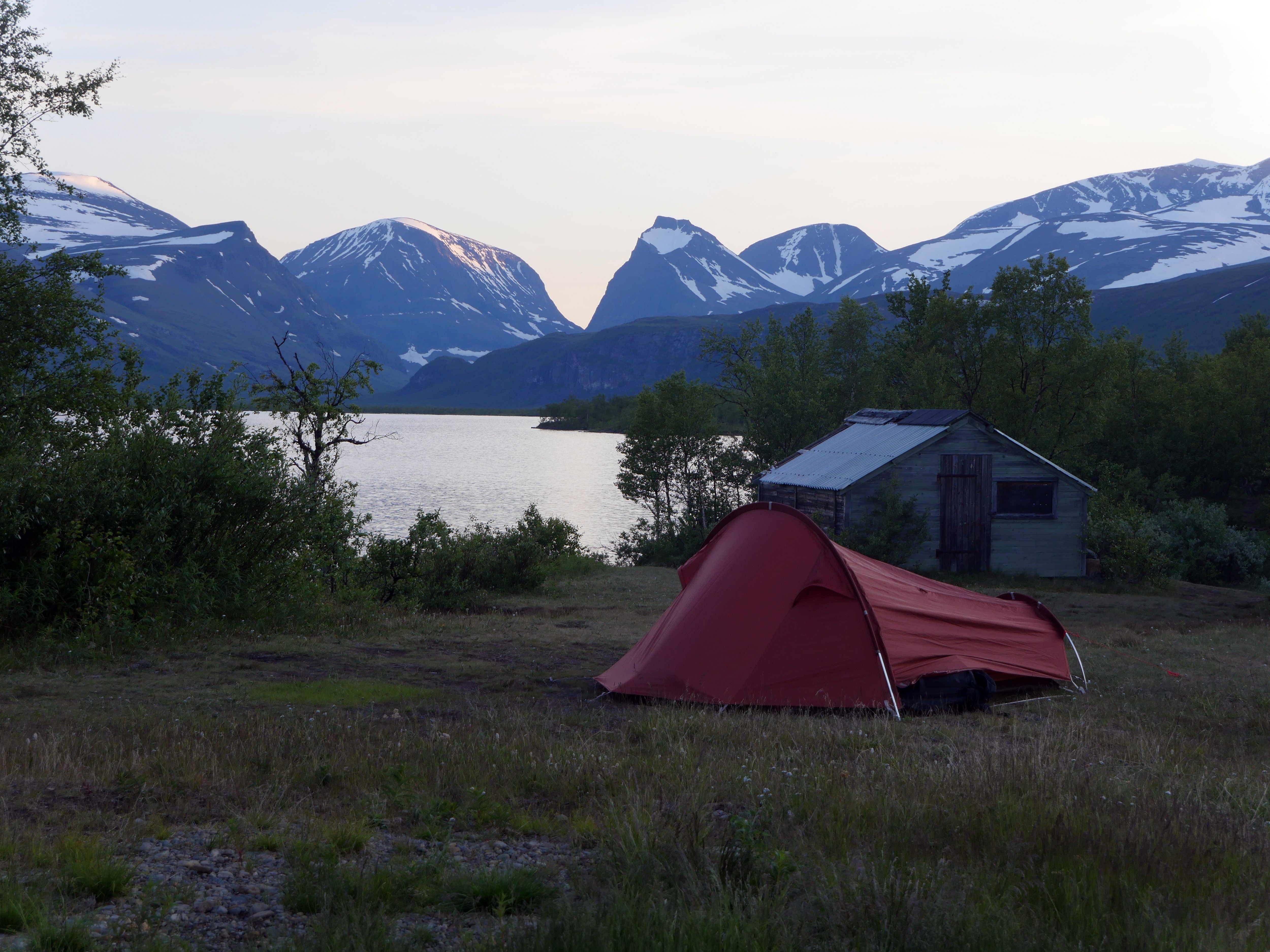 Vi anlände till Nikkaloukta sent på kvällen den tredje dagen. Men vi knallade till Ladtjoluskåtan. Jag insåg att det skulle hjälpa att ta båten längs Laddjujavri. Stigen såg dessutom tråkig ut på kartan. Utsikten över sjön mot Kebnekaise från platsen är med de bästa i världen!