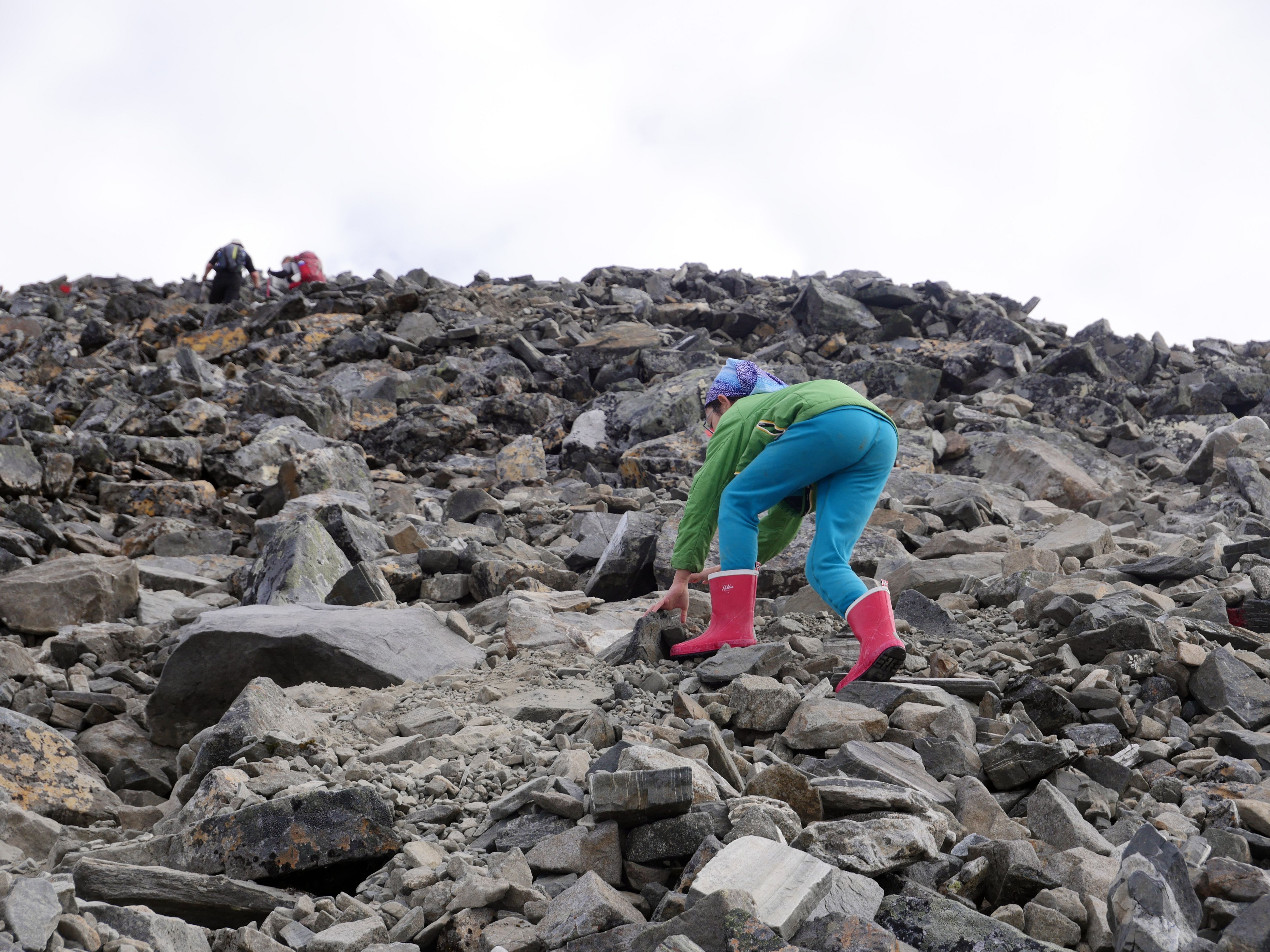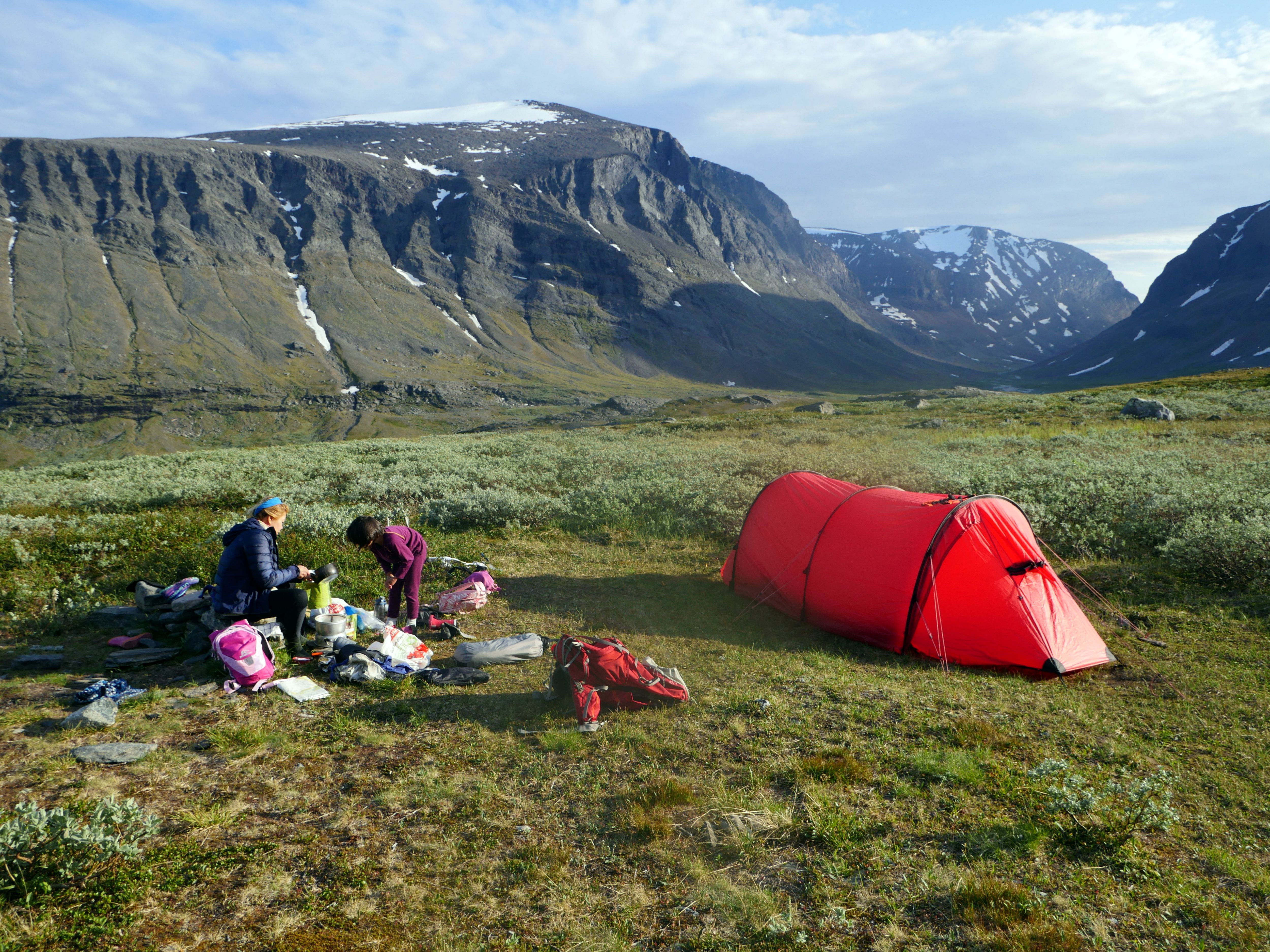 Vi tog första turen över sjön med mycket skämtsamma och trevliga Nikkalouktabor. En mycket varm morgon som bara skulle bli varmare. 26 grader. Det gjorde att det tog oss hela fem timmar att knalla de 8 km:na till Fjällstationen, där vi kort stannade för att köpa mat. Idén var att ha så lite grejer som möjligt och satsa allt på ett kort (bra väder….) under nästa dags toppförsök. Tre dagars körning och en tung, tung ryggsäck hade gjort mig lite seg. Vi knallade en timme bort från stationen, passerade Jökelbäcken och slog läger för natten. Vi kom överens om en tidig start, trots att tjejerna var lite möra. Vi med. Men för att undvika värsta värmen. Jag räknade med minst 15 timmars färd med tanke på tjejernas ungdom.