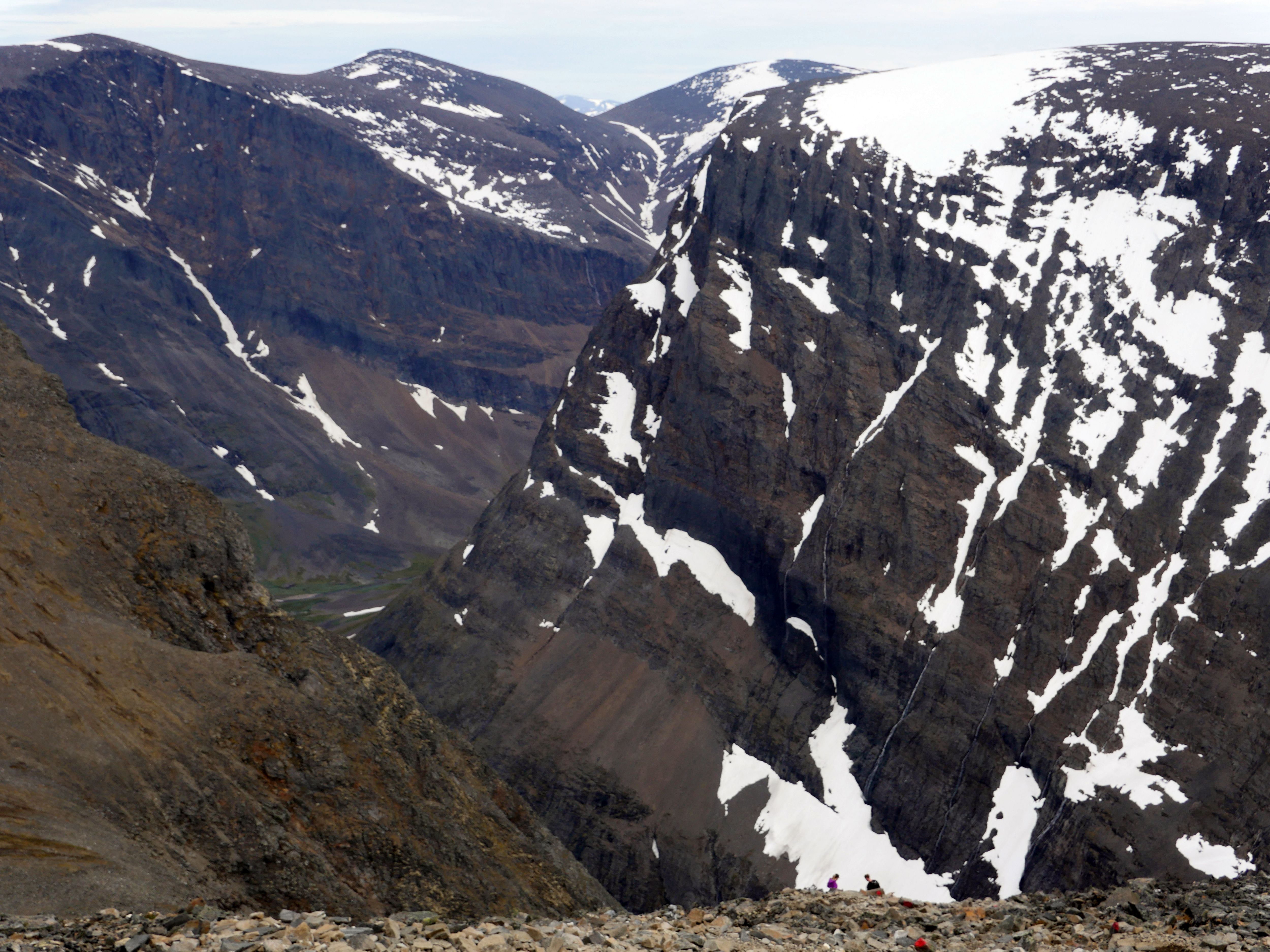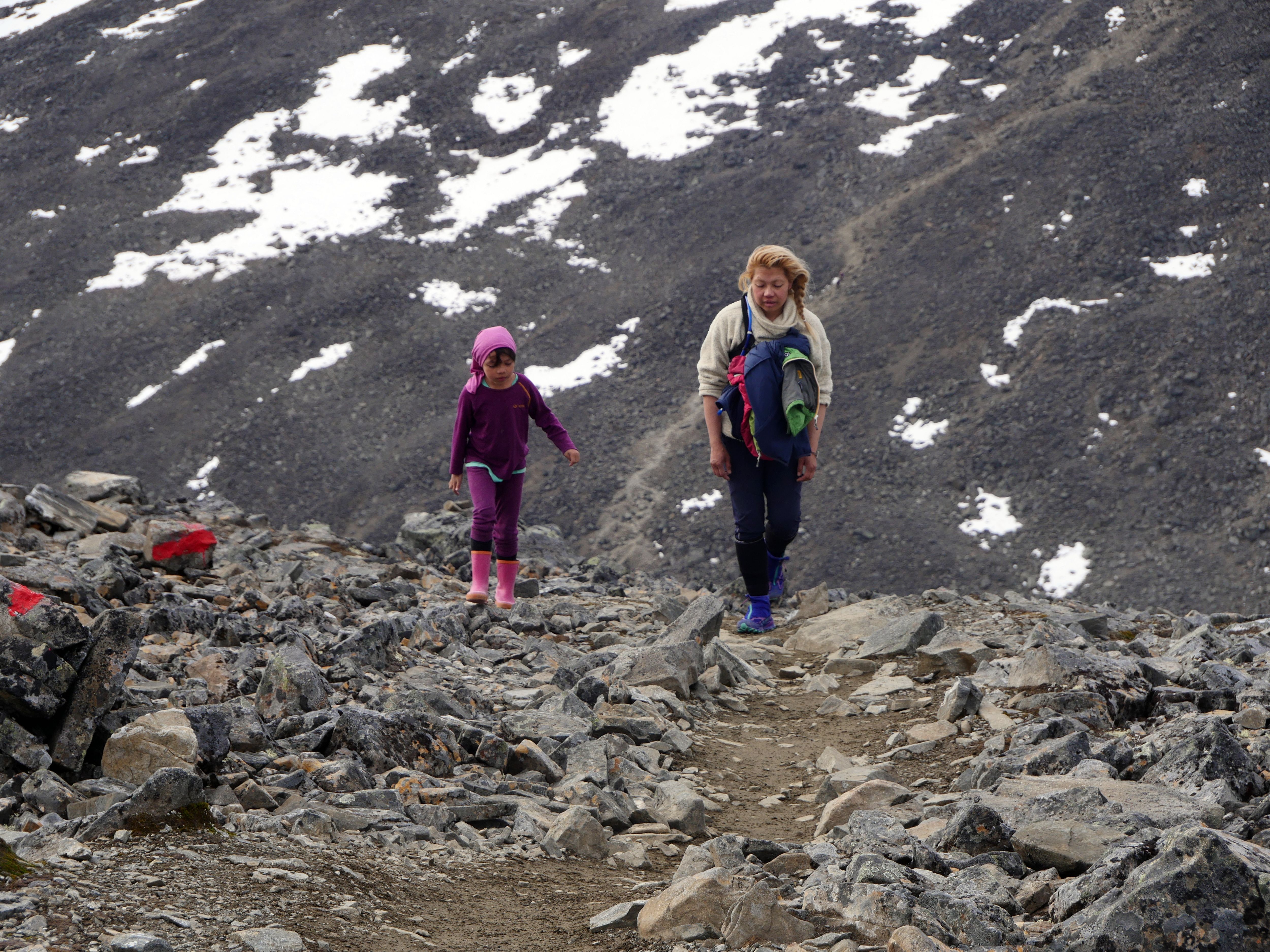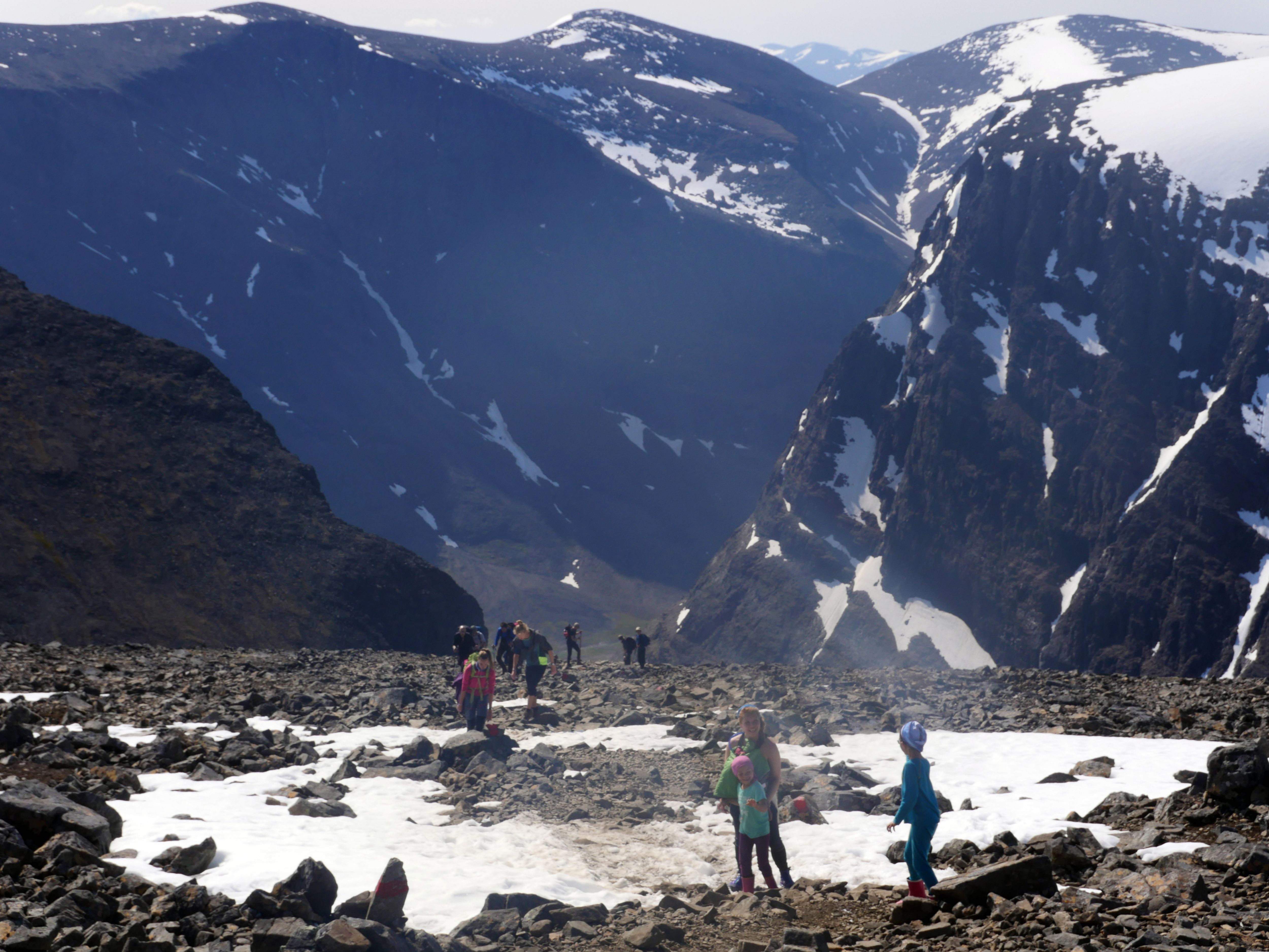 Vi lämnade lägret klockan sex. Varmt, varmt. Klättrade upp längs Kittelbäcken, passerade en fin stenbro och en mindre fin stålbro och där började den riktiga klättringen. Vi gick sakta men säkert och tjejerna hängde lätt med. Många passerade oss med svikt i stegen. Bestigningen är ju ganska enkel för den vane. Vi knallade upp över snön, stenbumlingar, grus och hamnade efter 4 timmar uppe på Vierrevarri. En del vuxna trodde detta var toppen och när de fick veta, vände en del åter. Sydtoppen syns ju inte härifrån. Det är nog en hel del som inte tittat på kartan innan. Vi visste ju, så motivationen var fortfarande hög. Tjejerna gnällde inte alls utan njöt av alla uppmuntrande ord från andra vandrare som häpet upptäckte ynglingarna på väg uppåt. En del kommenterade att de hade stövlar. För mig är vandrarskor helt onödigt. De är bara klumpiga, övervärderade och bara tar kraft. Jag hade valt stövlar för eventuella småbäckar och för att de satt så fint på tjejerna. Jag hade vanliga gymnastikskor som vanligt. Pam likaså. Ja trailskor. Jag ångrar att jag inte tog Teva som vanligt med neoprenstrumpor som jag annars gör. (Tjejerna hade inte minsta lilla skavsår efteråt förresten. Inte vi heller)