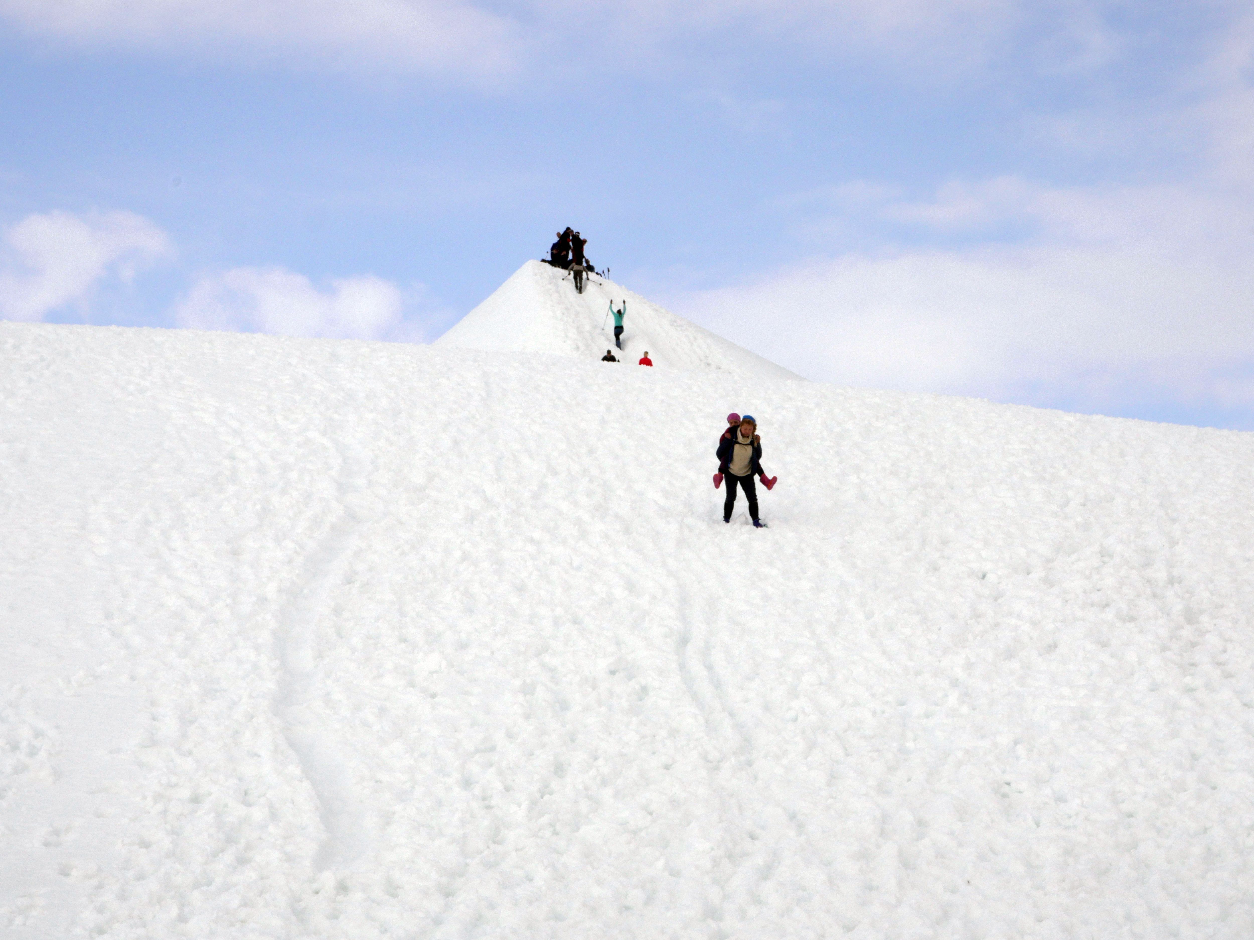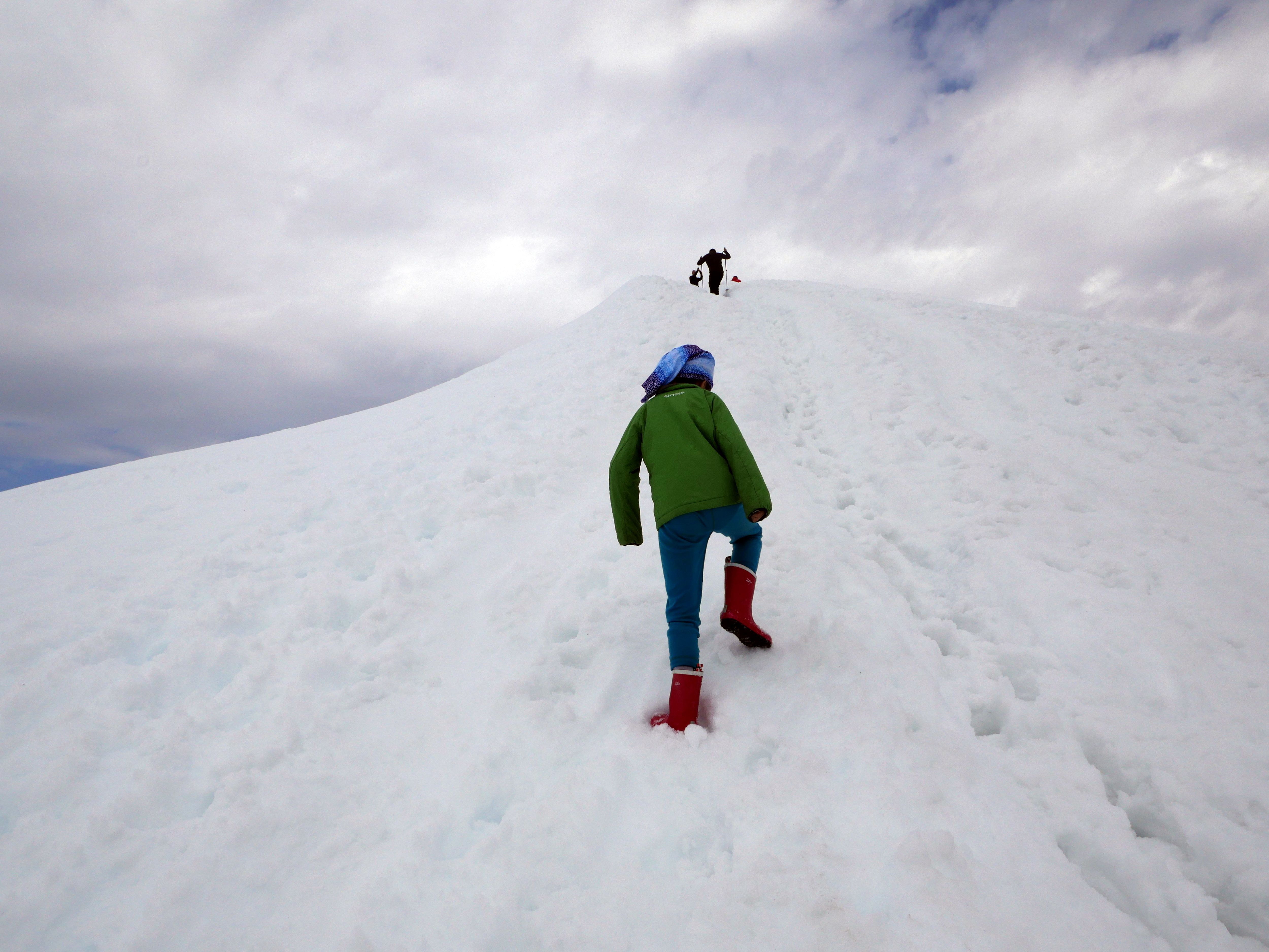 Vi hade alla genomblöta fötter. Solen gick i moln och vi vände åter. Det tog oss sju timmar upp. 8 och en halv tillbaka till tältet. Vi var trötta allihop, men sjöng och gjorde olika tävlingar på vägen ned. Folk uppmuntrade tjejerna för deras promenad och det underlättade mycket.