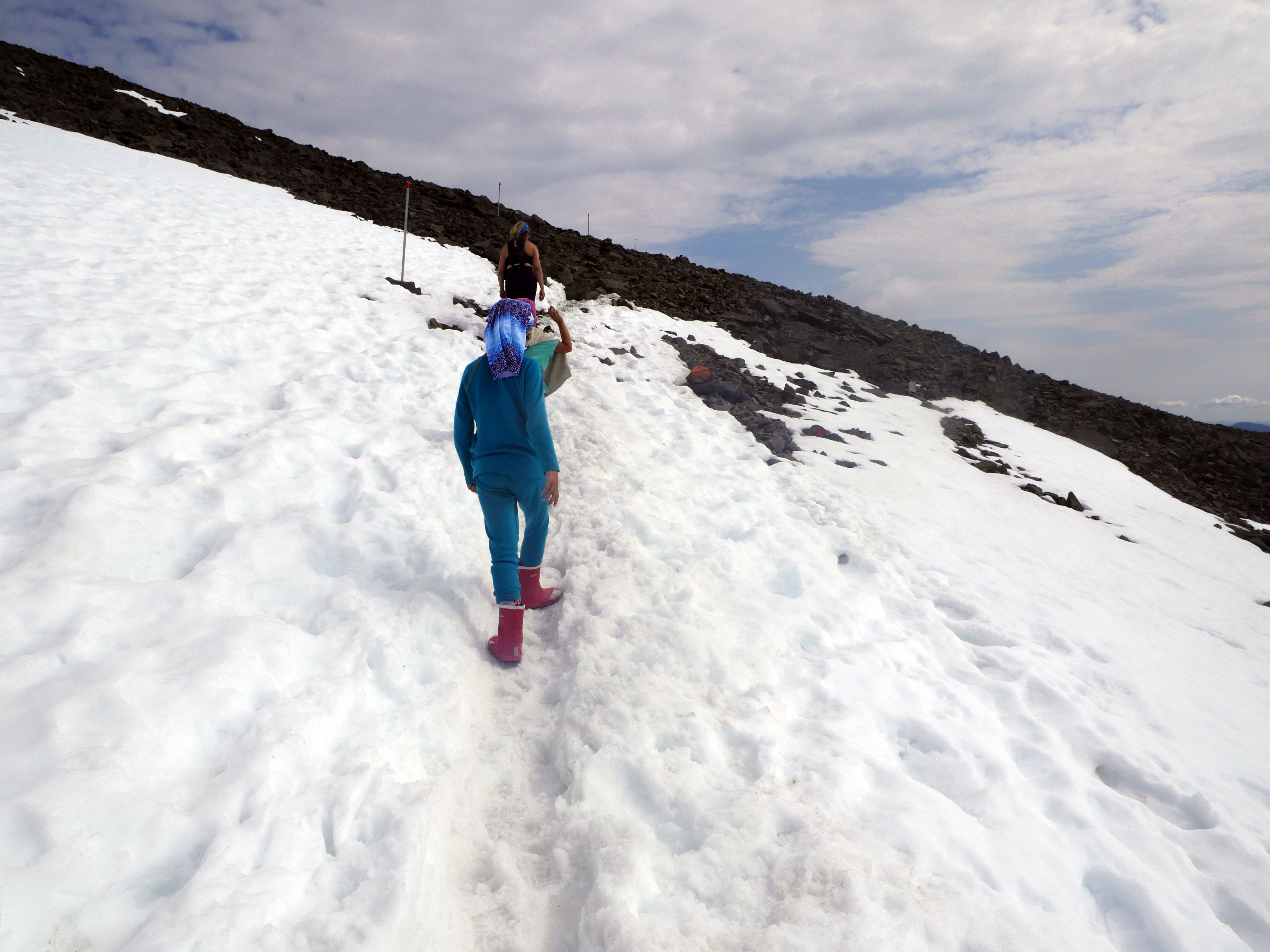 Vi hade alla genomblöta fötter. Solen gick i moln och vi vände åter. Det tog oss sju timmar upp. 8 och en halv tillbaka till tältet. Vi var trötta allihop, men sjöng och gjorde olika tävlingar på vägen ned. Folk uppmuntrade tjejerna för deras promenad och det underlättade mycket.