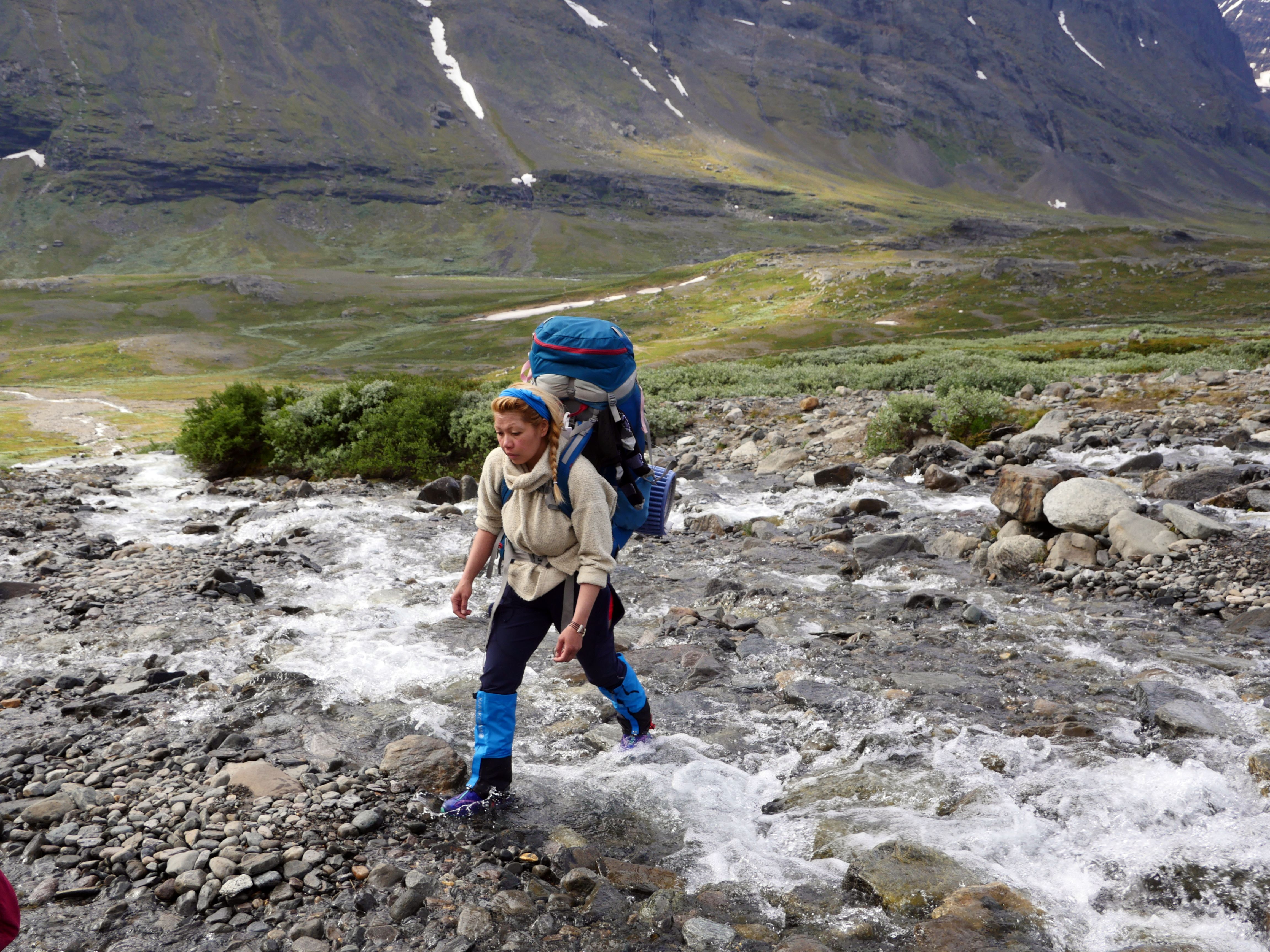 Vi tog första turen över sjön med mycket skämtsamma och trevliga Nikkalouktabor. En mycket varm morgon som bara skulle bli varmare. 26 grader. Det gjorde att det tog oss hela fem timmar att knalla de 8 km:na till Fjällstationen, där vi kort stannade för att köpa mat. Idén var att ha så lite grejer som möjligt och satsa allt på ett kort (bra väder….) under nästa dags toppförsök. Tre dagars körning och en tung, tung ryggsäck hade gjort mig lite seg. Vi knallade en timme bort från stationen, passerade Jökelbäcken och slog läger för natten. Vi kom överens om en tidig start, trots att tjejerna var lite möra. Vi med. Men för att undvika värsta värmen. Jag räknade med minst 15 timmars färd med tanke på tjejernas ungdom.