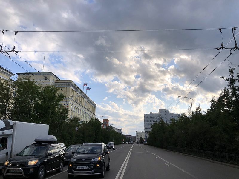 The taxi was beat up, but the driver very friendly. Like most Russians, open, opinionated, interested and helpful. Murmansk has about 300 000 inhabitants today. In 1989 it had 468 000. It is a shrinking Arctic port. I enjoyed the drive from the airport, situated 35 kms from the city. It took us through some green taiga, rivers and lakes. From the airplane I noticed that there were fewer forest clearings than I had expected. What I read in media beforehand, was that there is big clearings of forest all over the country. Bolsanaro style. And now forest fires were raging like mad all over Siberia. Murmansk had been affected too 2018. I did see some brutal clearings Soviet style, when it was man versus nature. But not many. At least not from the airplane.
