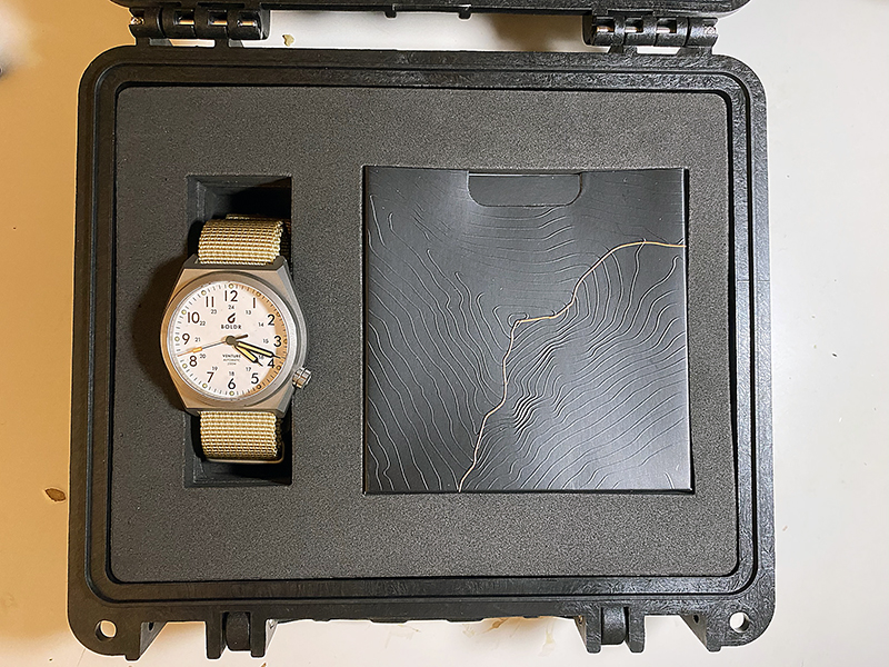 I opened the delivery. There it was! First, the protoype for the perfect outdoor knife! And a small water- and battleprooved case with a Titanium watch! Both items beautiful for the eye!