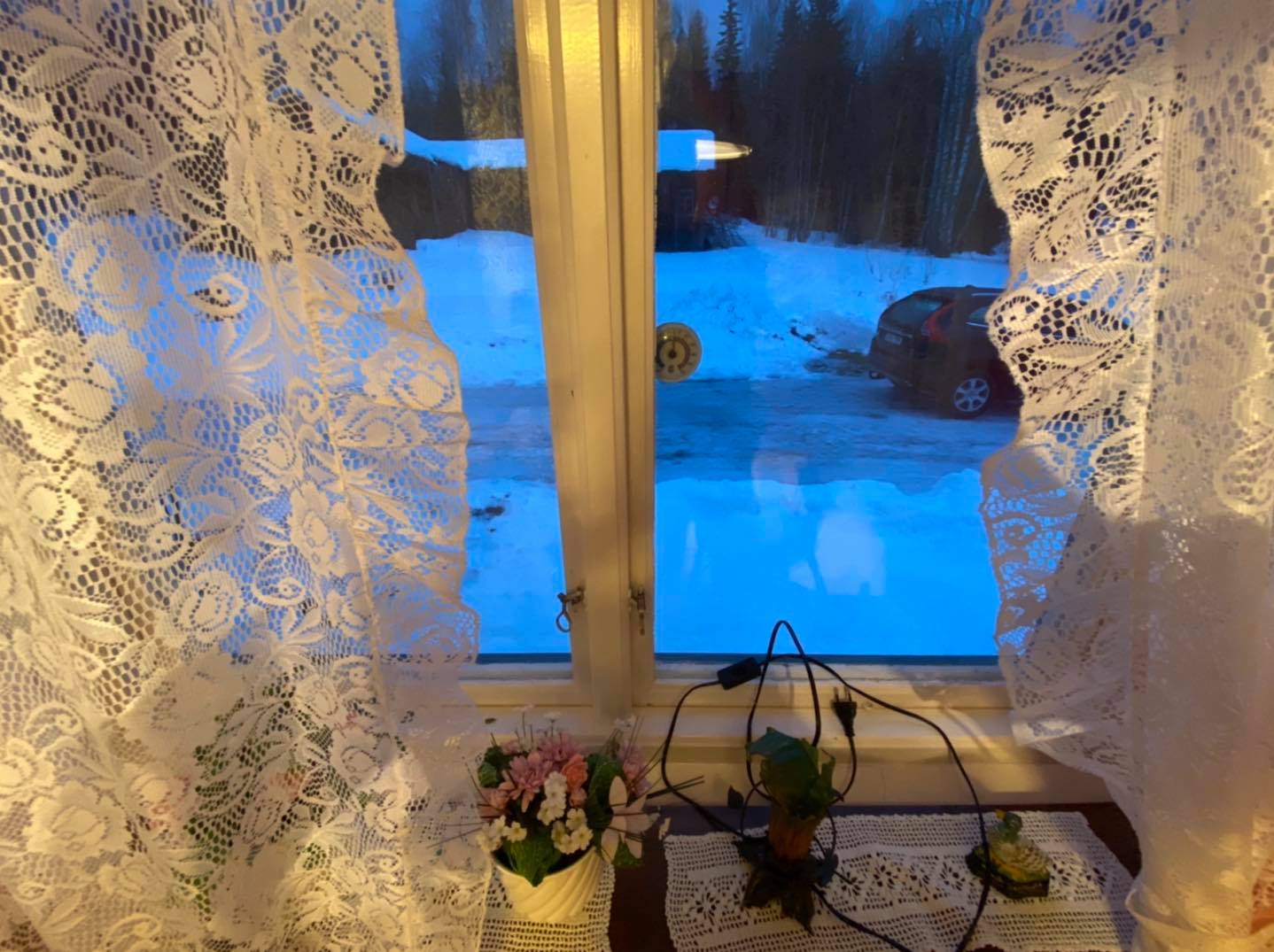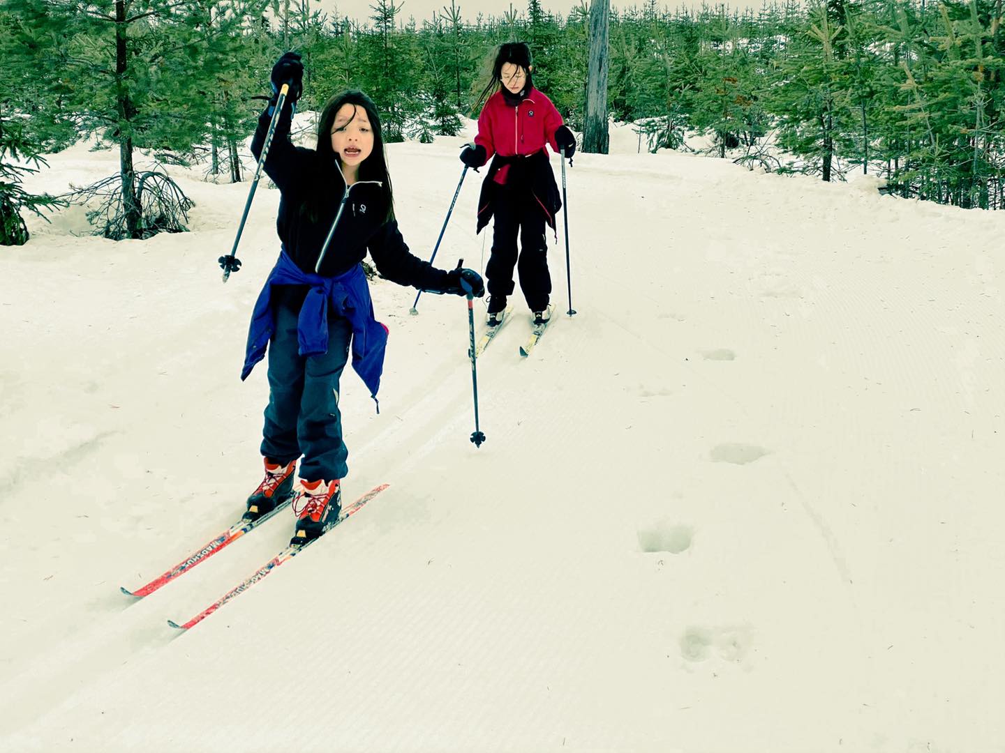 “Fjolårskalv” , sade jag och chockade tjejerna med att jag jagat och skjutit älg en gång i tiden. Vi körde det korta Myrspåret på Kläppen. 5 km. Fina harspår. Men halvdana skidspår. Mycket barr och lösa kanter till följd av värmen och småregnet. Och så hade jag förväxlat skidstavar med slalomstavar. Så de hade en av varje. Och jag som i en tidigare skrift klagat på farsans misslyckade vallning i mina tidigaste ungdomsår. Tjejerna var arga på mitt misstag. Klistret sög upp högvis med barr.