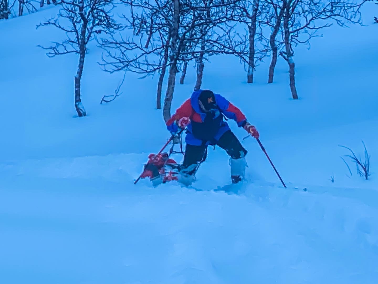 This time Milka came with much better skis and climbed easily up to camp. This was James first time on skis and not used to skins, had a hard time, but fought hard.