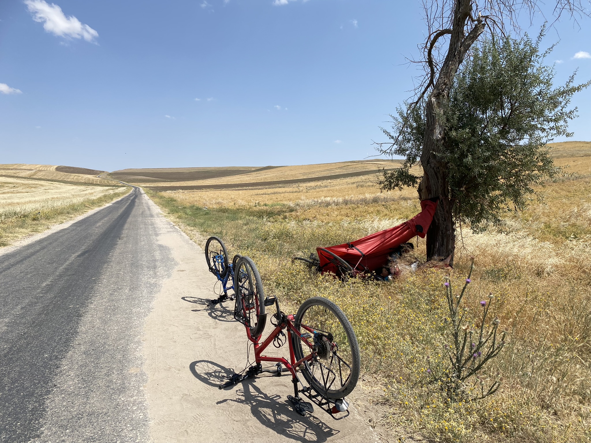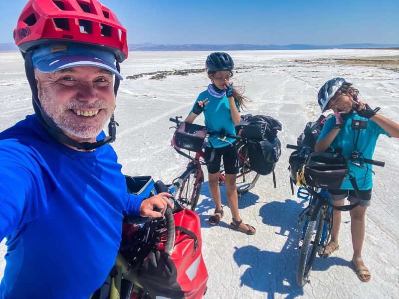We initiallty started to do 30-35 kms a day, lots of breaks, lots of fun. Free camping is the preffered method. At the end of the first journey, the girls did 50-55 km on gravel. 3 years on, on tough roads in the outback of Turkey, they average 60 km comfortably a day.