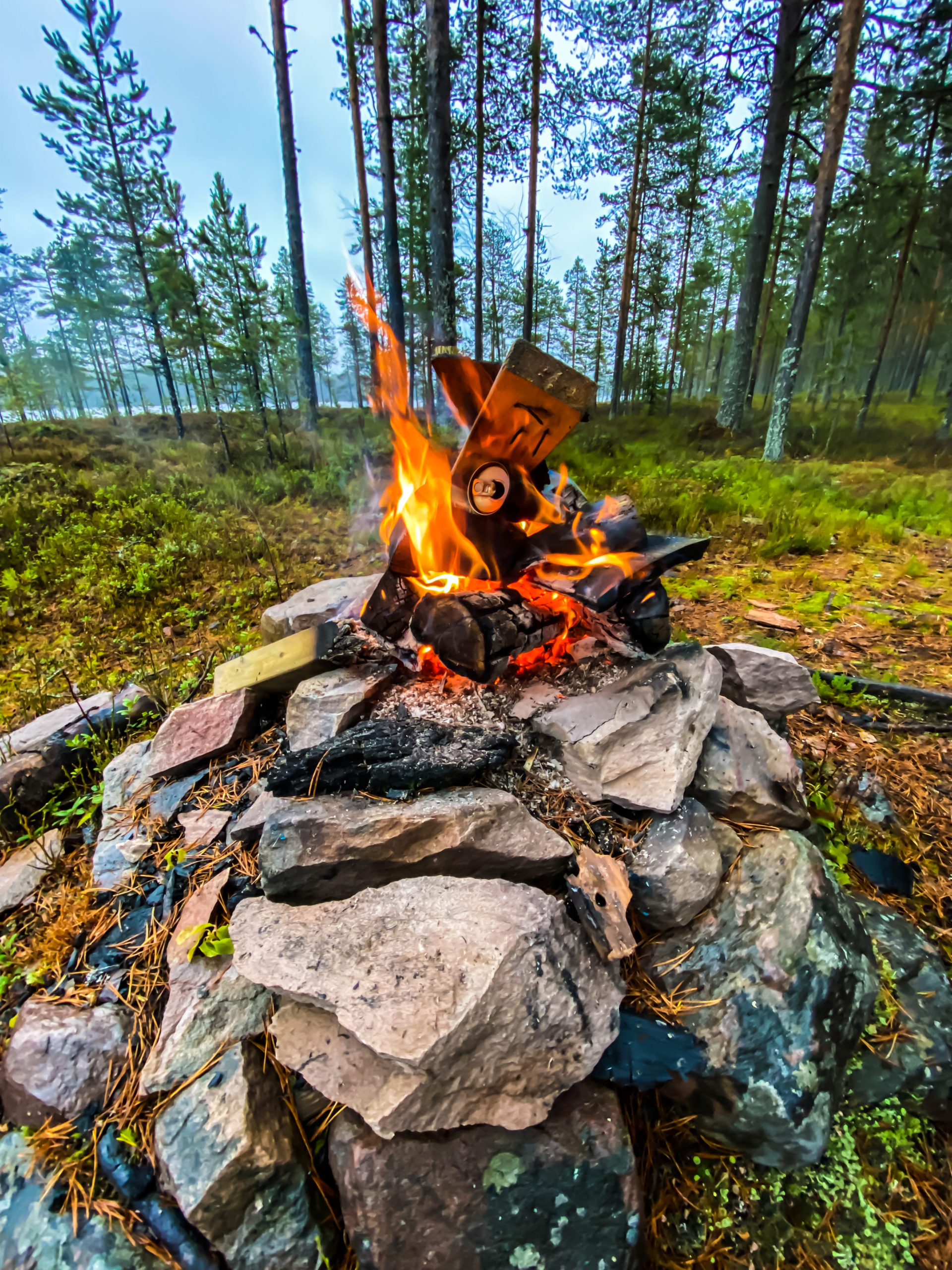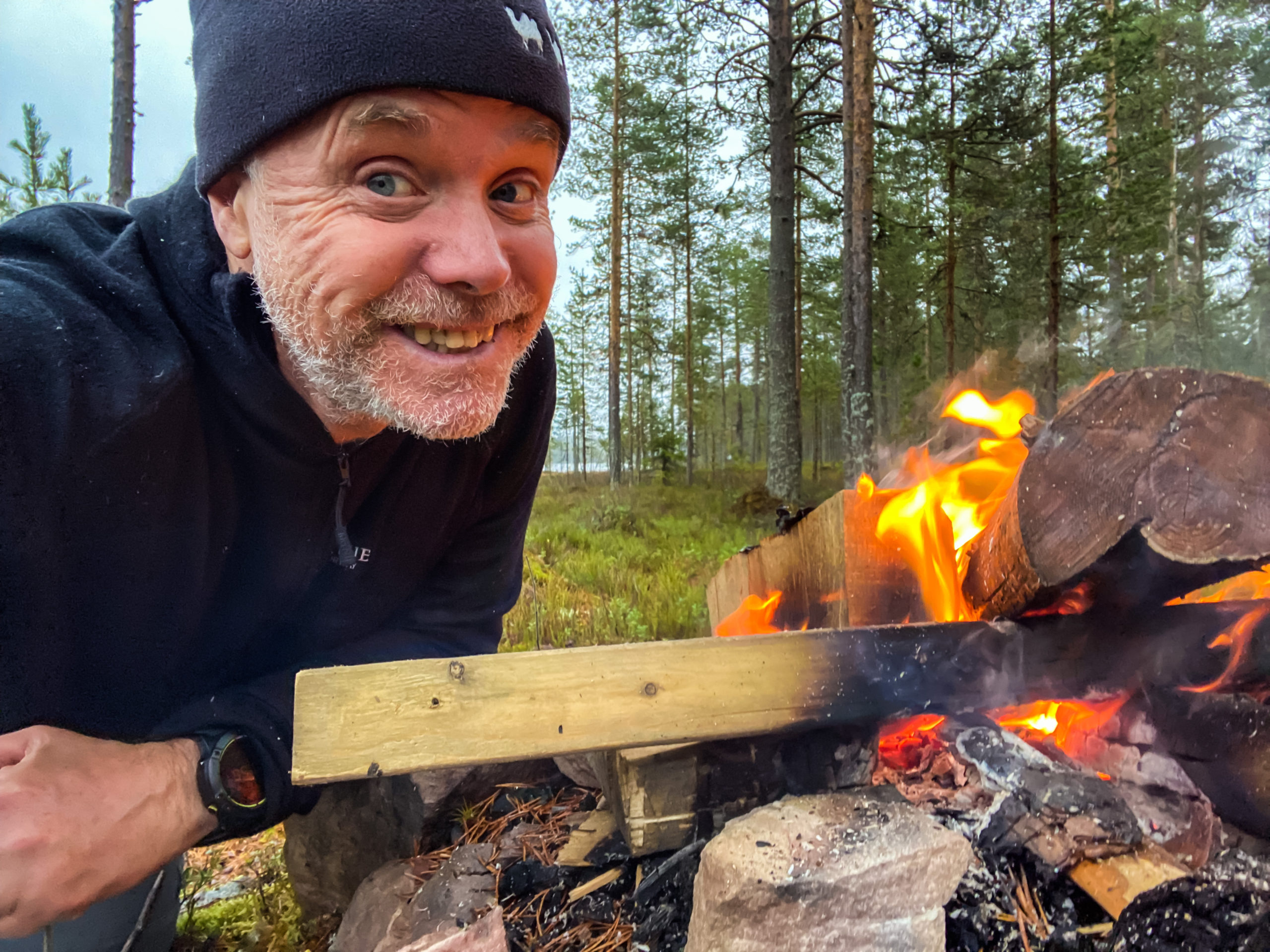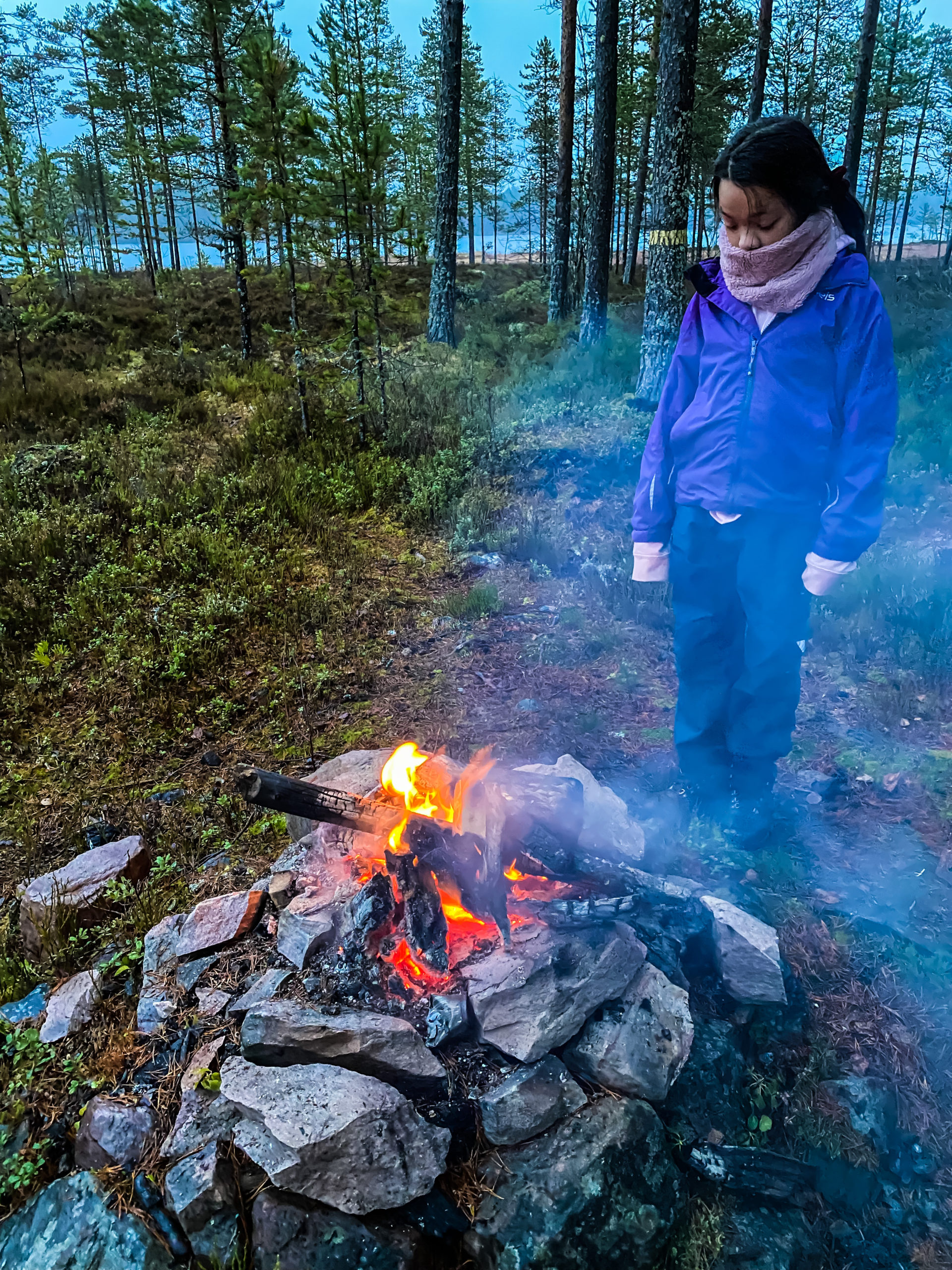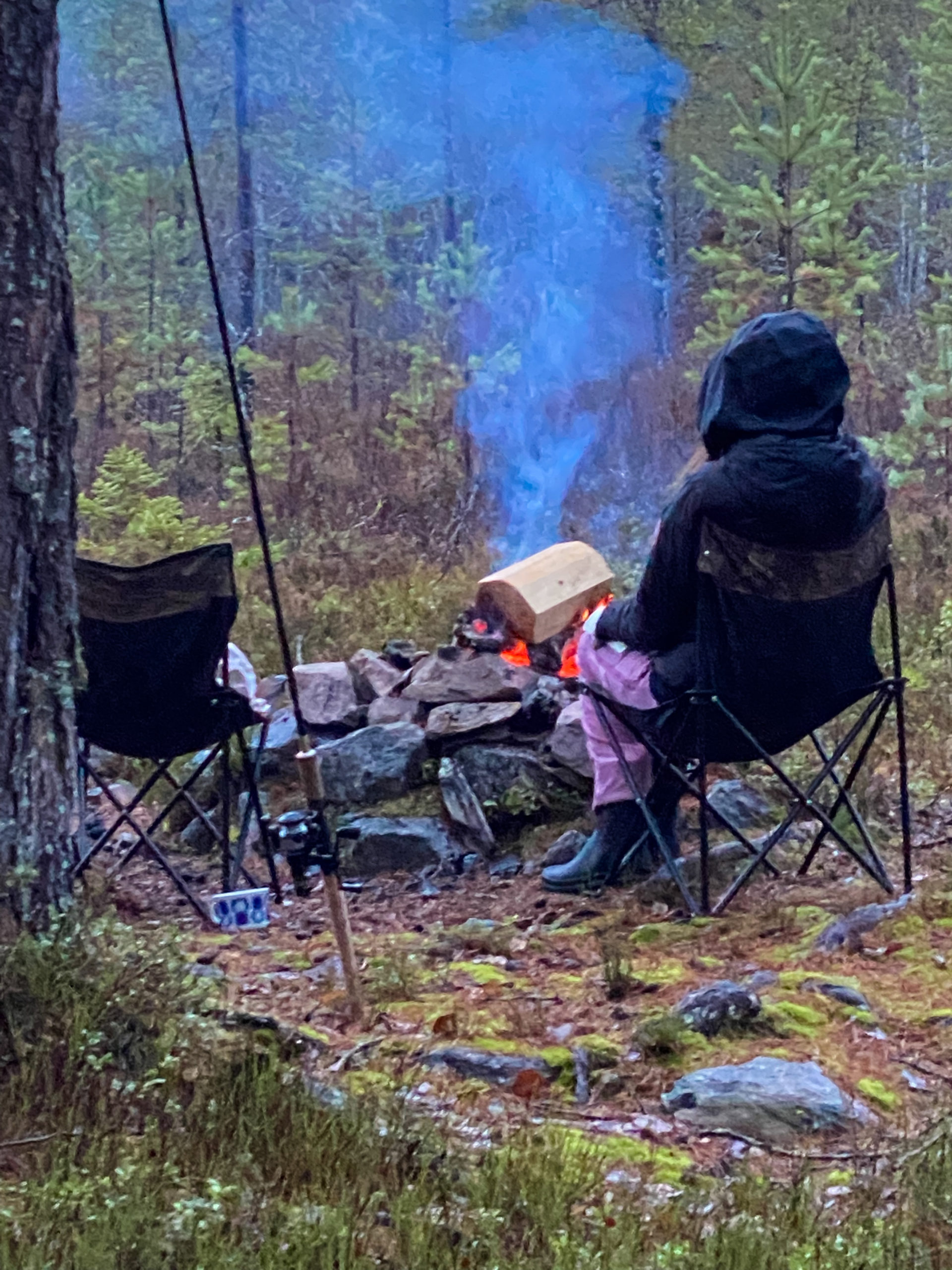 I duggregn sitter vi runt elden tills mörkret faller på. Rösjön är en klassisk norröver sjö med myr, sten, holmar och sällan fisk! Mest sitter vi runt elden och grejar med den. Det blir inte mycket bättre än så. Eva läser, Dana grejer och jag bara njuter av att hålla elden liten men vid liv.