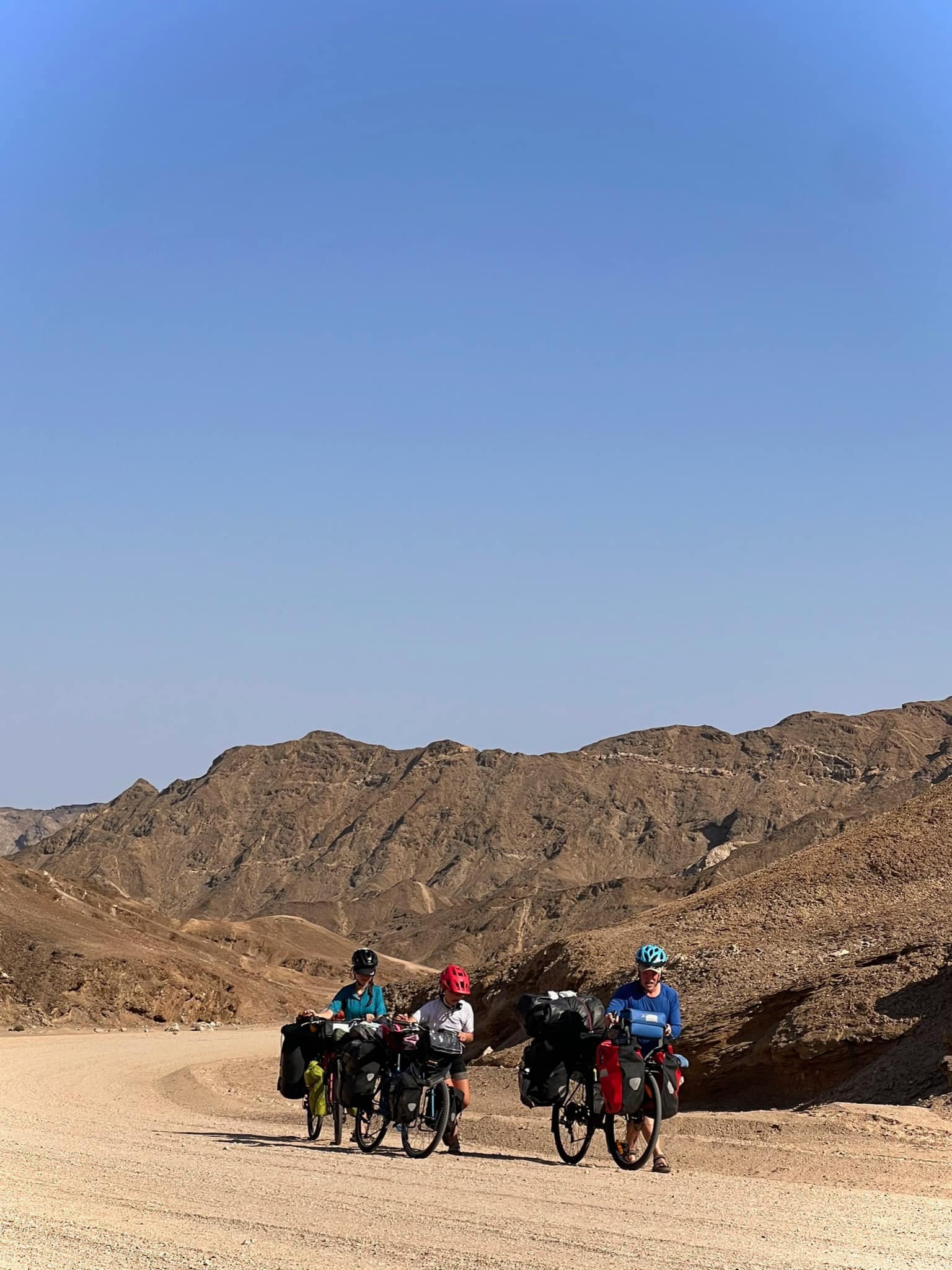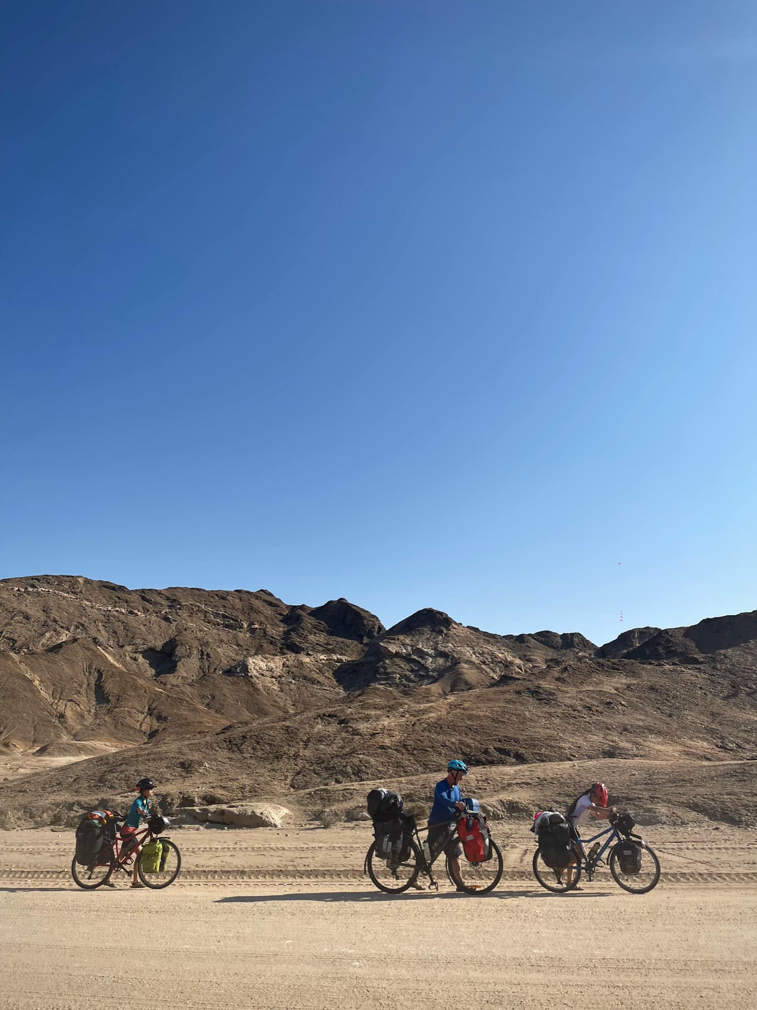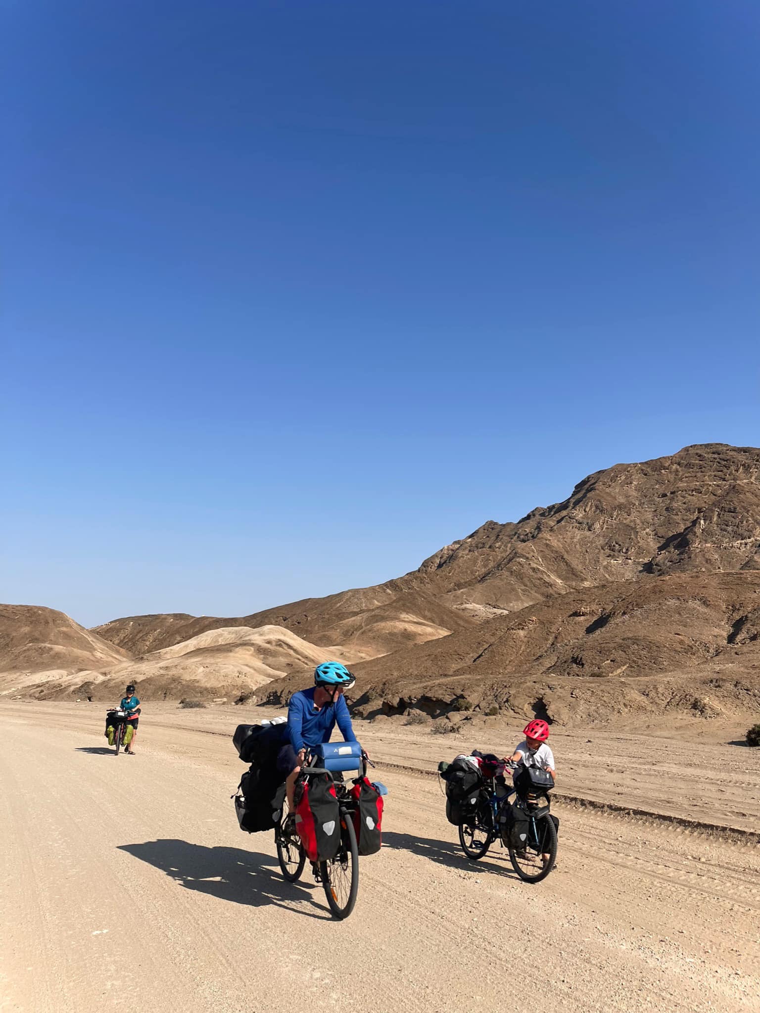 Not the first time. We started off with a really hot, sandy uphill through a spectacular desert. Eva was tired and told me her period was bad. Sofie and Caleb had to leave by 12. So just when we reached the top of the climb, I realised that we were heading the wrong way, too late. So we put the bikes on the pickup and drove 12 km to the main road. Sofie and Caleb had to leave. We had 45 kms to Swakopmund and the girls where void of energy.