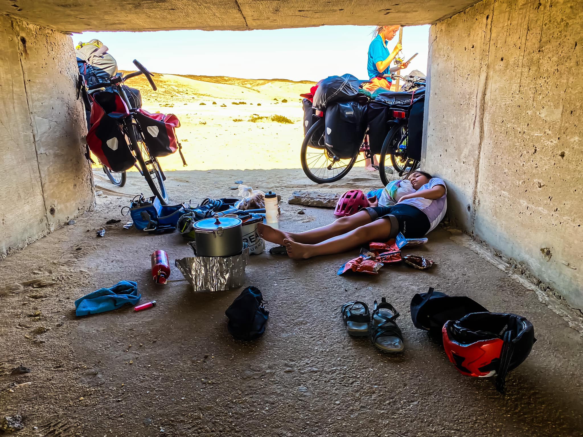 They wanted to do it their way. Not drinking or eating. But we had to get out of the sun and wind, there was no shelter to be seen. Main road was too busy, so we sat of down a dirt road following the pipeline and the I saw the road drum. We steered over there, into the shade, a immediately cooked lunch made up of Real Turmat dried frozen packets I had at backup. And an hour later we were laughing, joking and feeling happy together. Eva said: