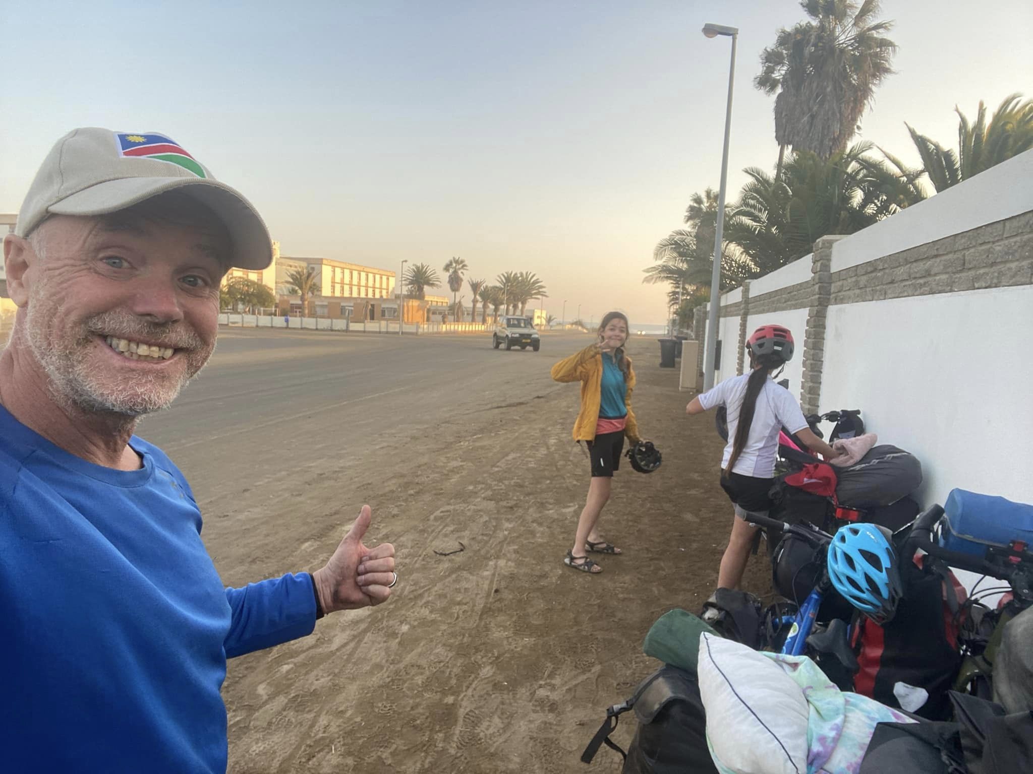 I have to say my daughters are fantastic. This break over 2 hours hardened them again. They even said they liked the challenge and we felt closer than ever. I had seen it so many times before. They always recharge and regain power. But we still had 45 kms to do. At 4 it had cooled down considerably and we decided to try the busy road with asphalt. Traffic is merciless and the driving some of the worst I have ever encountered, but we stuck together and dealt with all perfectly. We arrived in Swakopmund just before sunset.