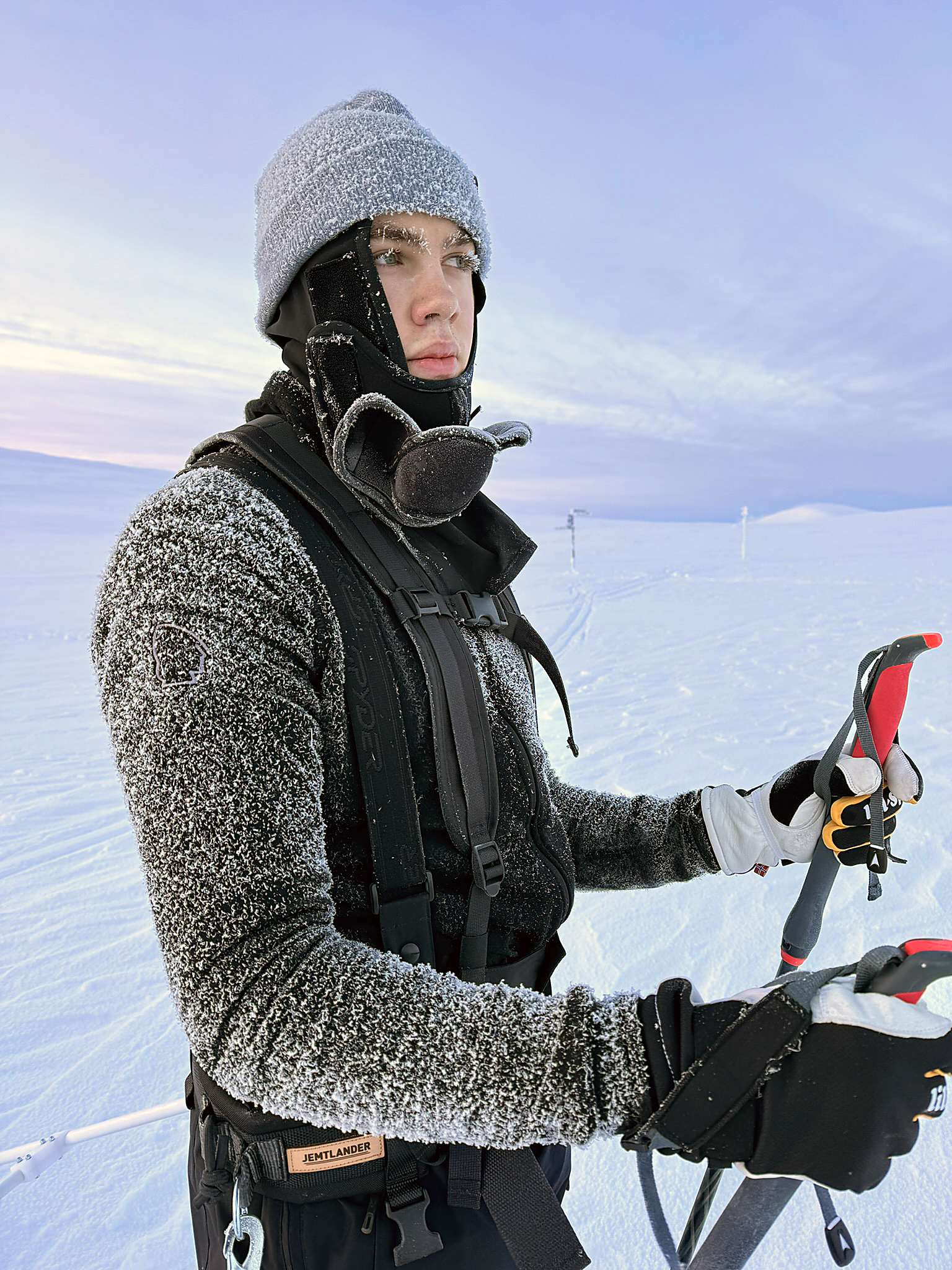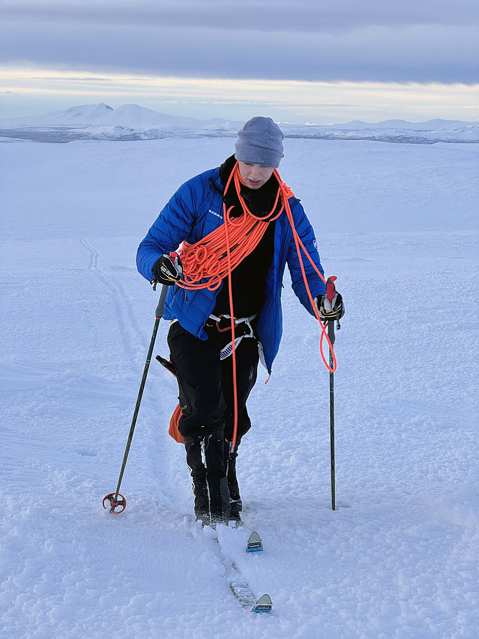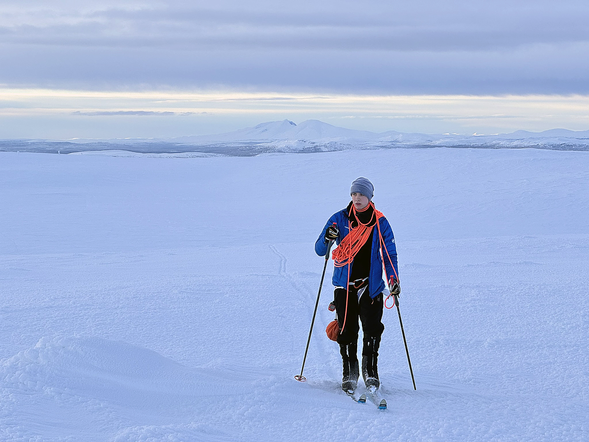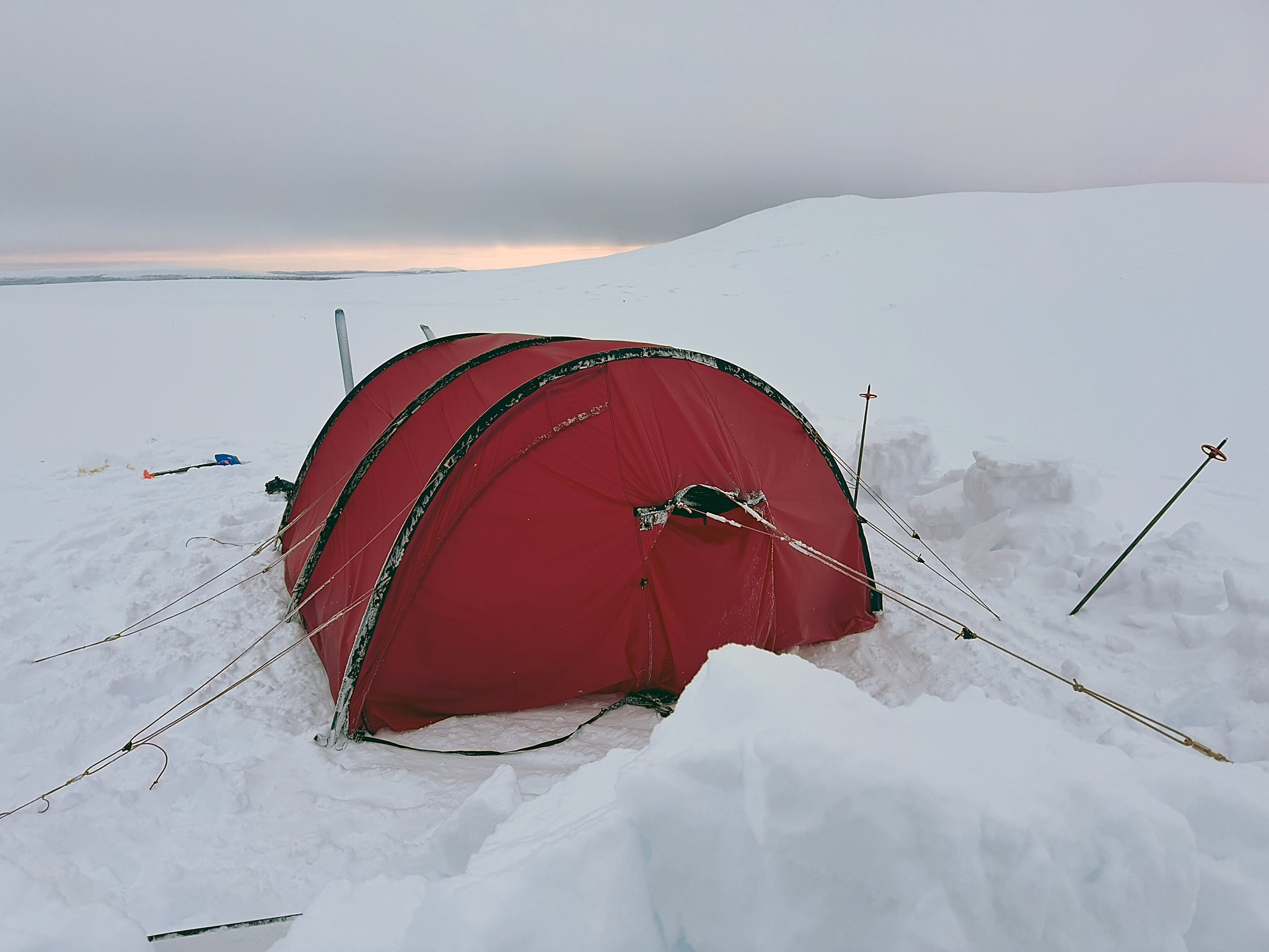 We made camp about a kilometer from the base of Storvätteshågna, which we wanted to climb and test crampons, rope and more the following day. Weather was cold around -28 dergrees C, great visibility, hardly any wind. So perfect Arctic travel weather. We made a simple camp with Max doing the wall to cover the tent, whilst I made everything ready inside. And started cooking. I did the same mistake as in Namibia. I had brought diesel and had no primer for that reason. In Namibia I used liongrass to prime the stove and now in the tent, toilet paper. It worked. max thought that the food from RealMat was so good he could consider eating it at his university.