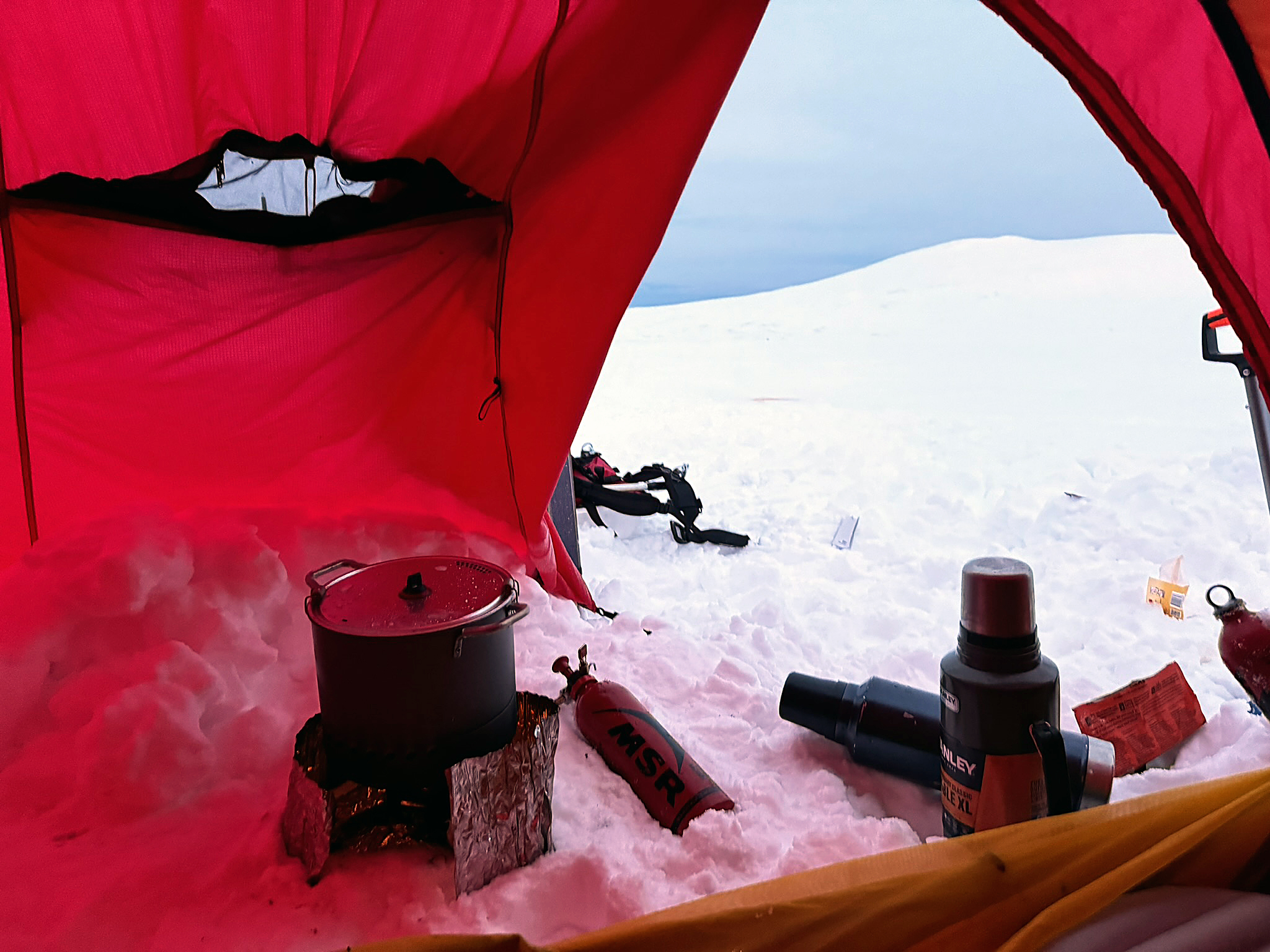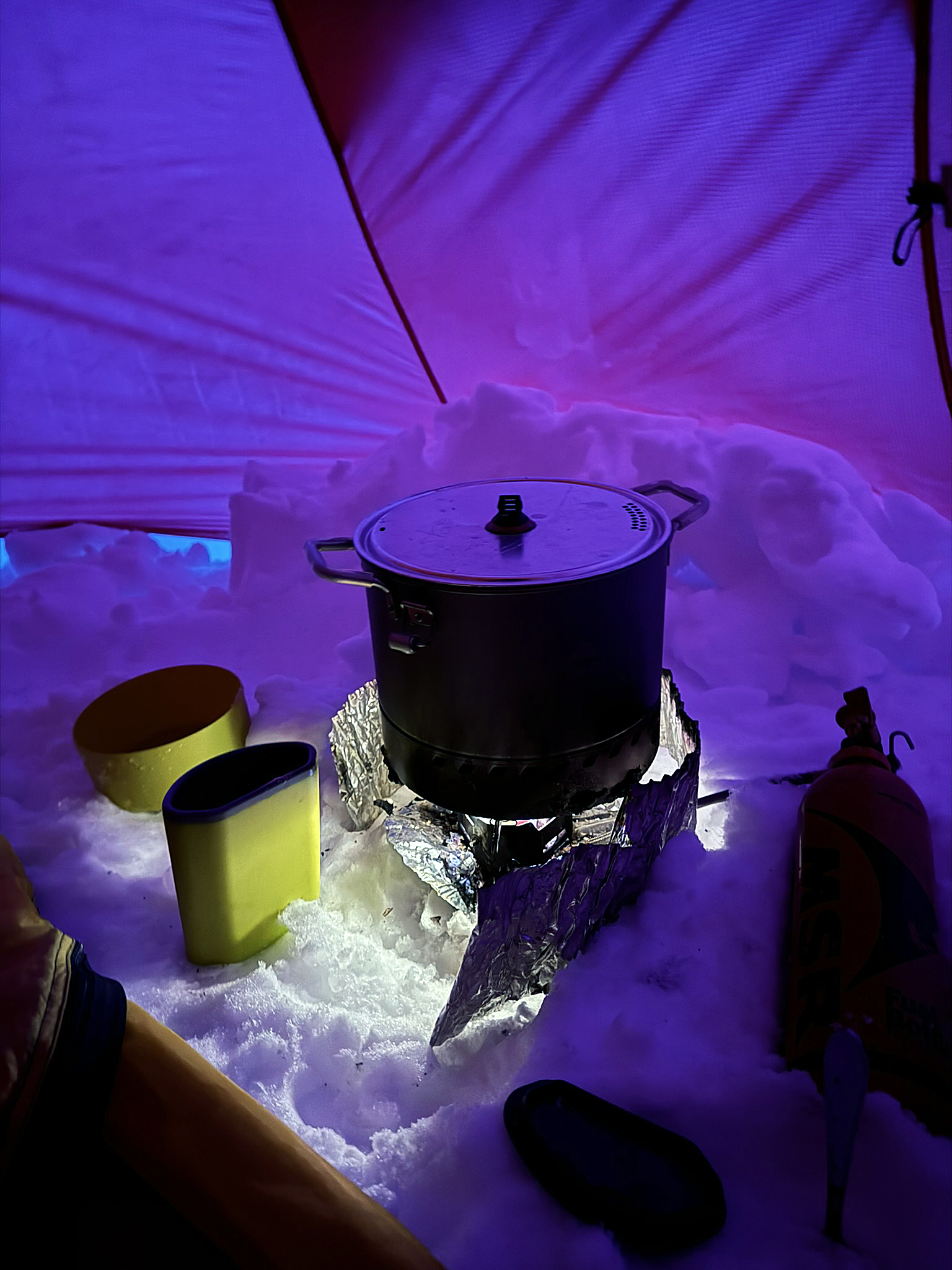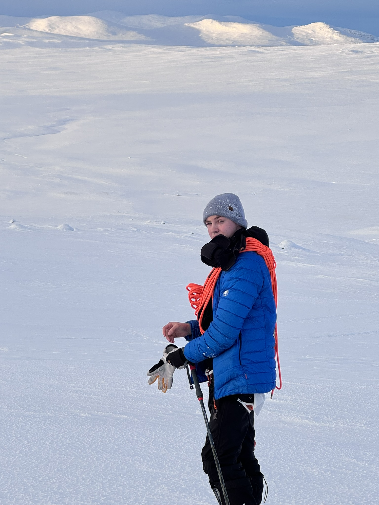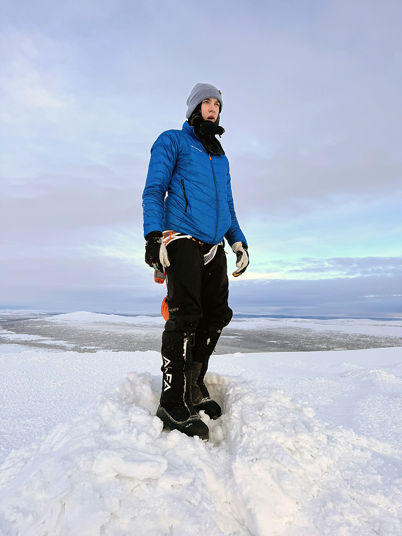 We made camp about a kilometer from the base of Storvätteshågna, which we wanted to climb and test crampons, rope and more the following day. Weather was cold around -28 dergrees C, great visibility, hardly any wind. So perfect Arctic travel weather. We made a simple camp with Max doing the wall to cover the tent, whilst I made everything ready inside. And started cooking. I did the same mistake as in Namibia. I had brought diesel and had no primer for that reason. In Namibia I used liongrass to prime the stove and now in the tent, toilet paper. It worked. max thought that the food from RealMat was so good he could consider eating it at his university.