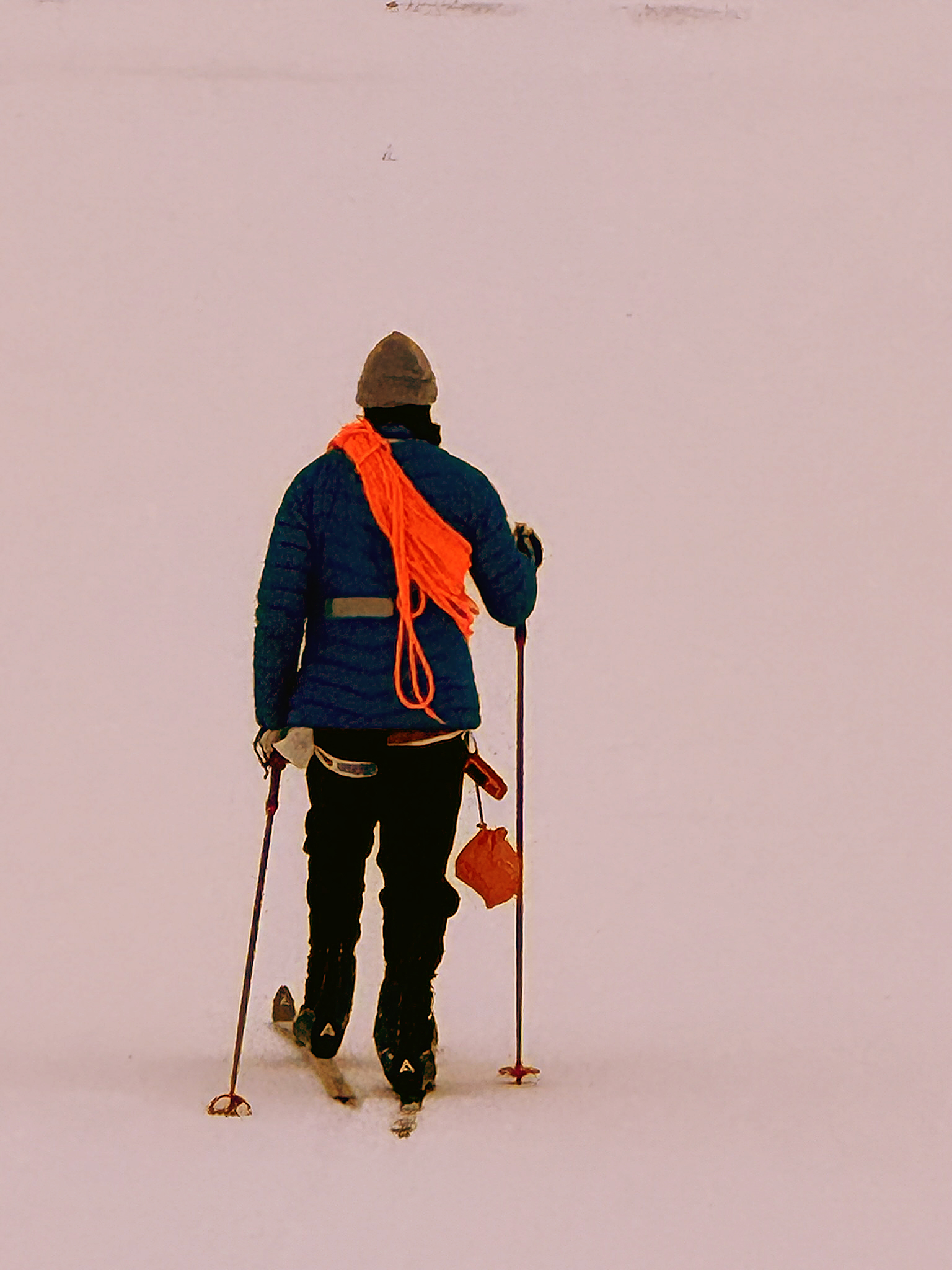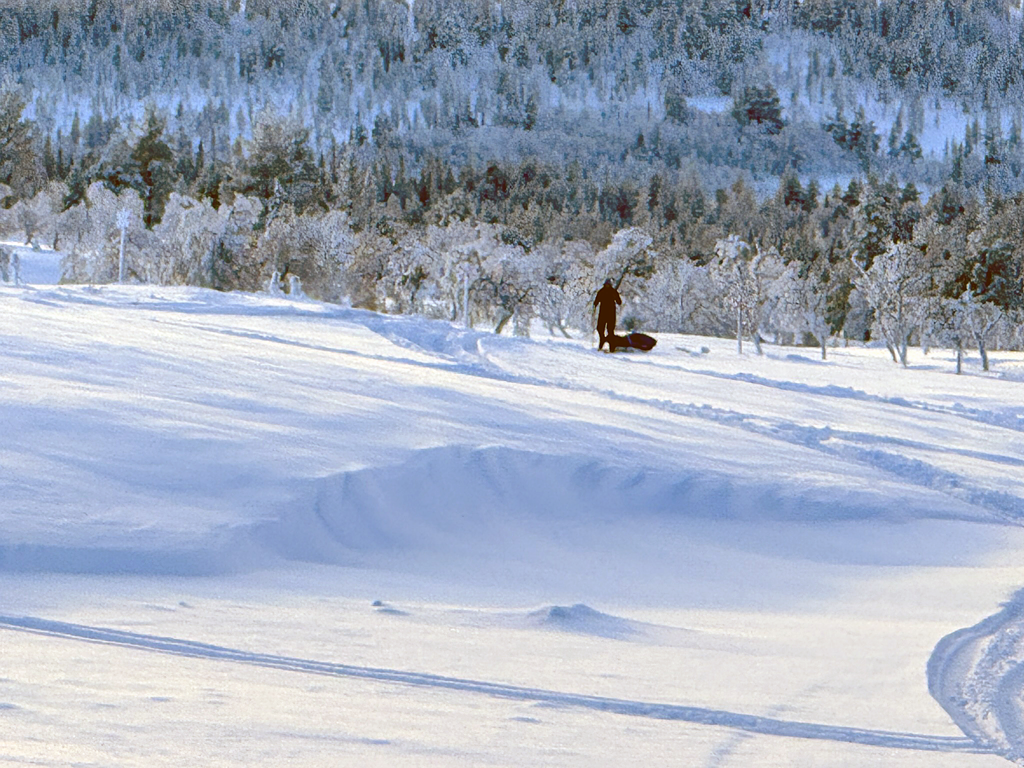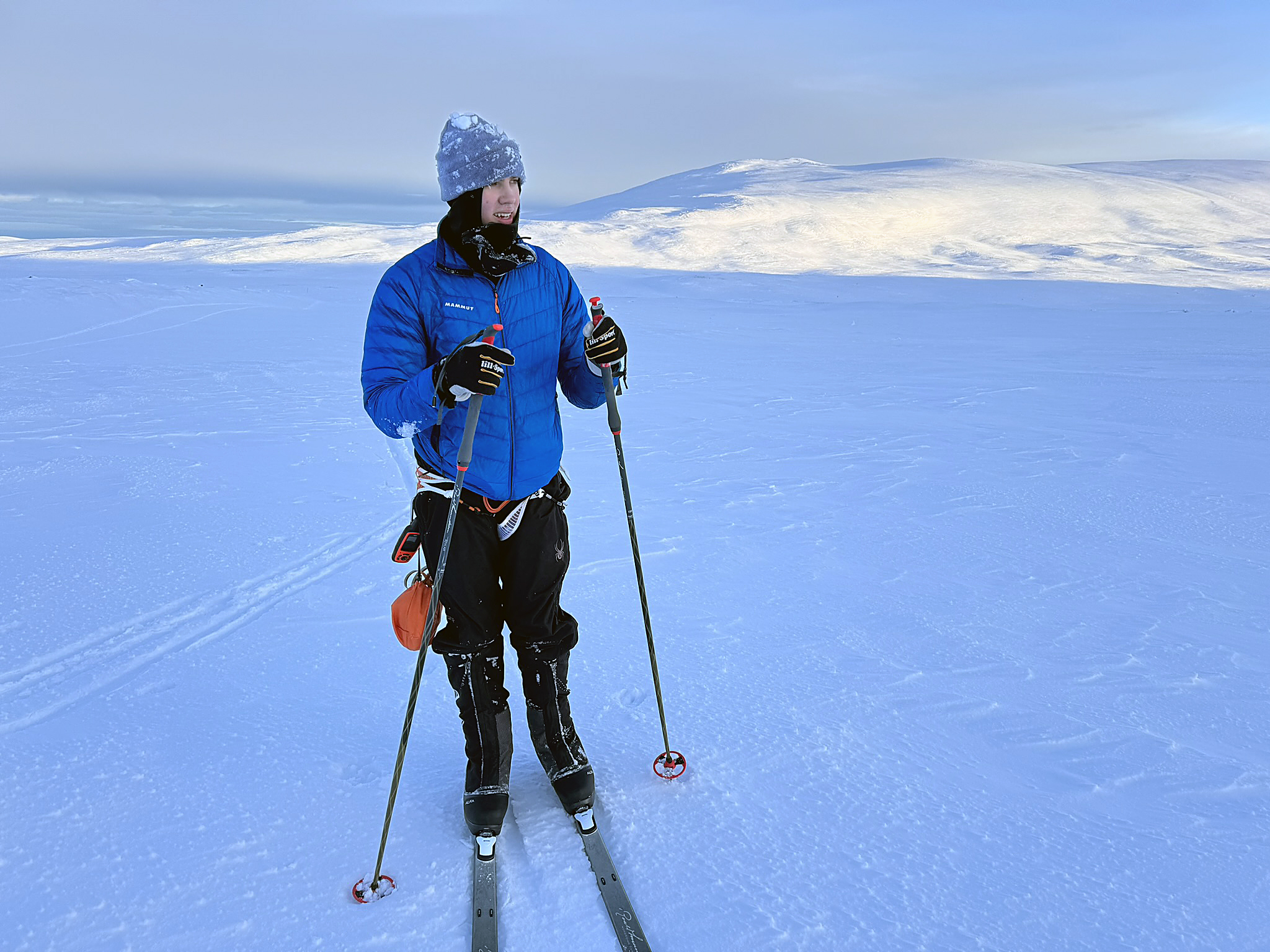 It was getting dark at just after three, so we only had a couple of hours of skiing and finding a place to pitch the tent. I asked Max to lead and he sat off as a rocket up the firtst hill and we did the long climb in 25 minutes. Almost up, he asked me if he could stop and take his jacket off because he was sweating so hard.