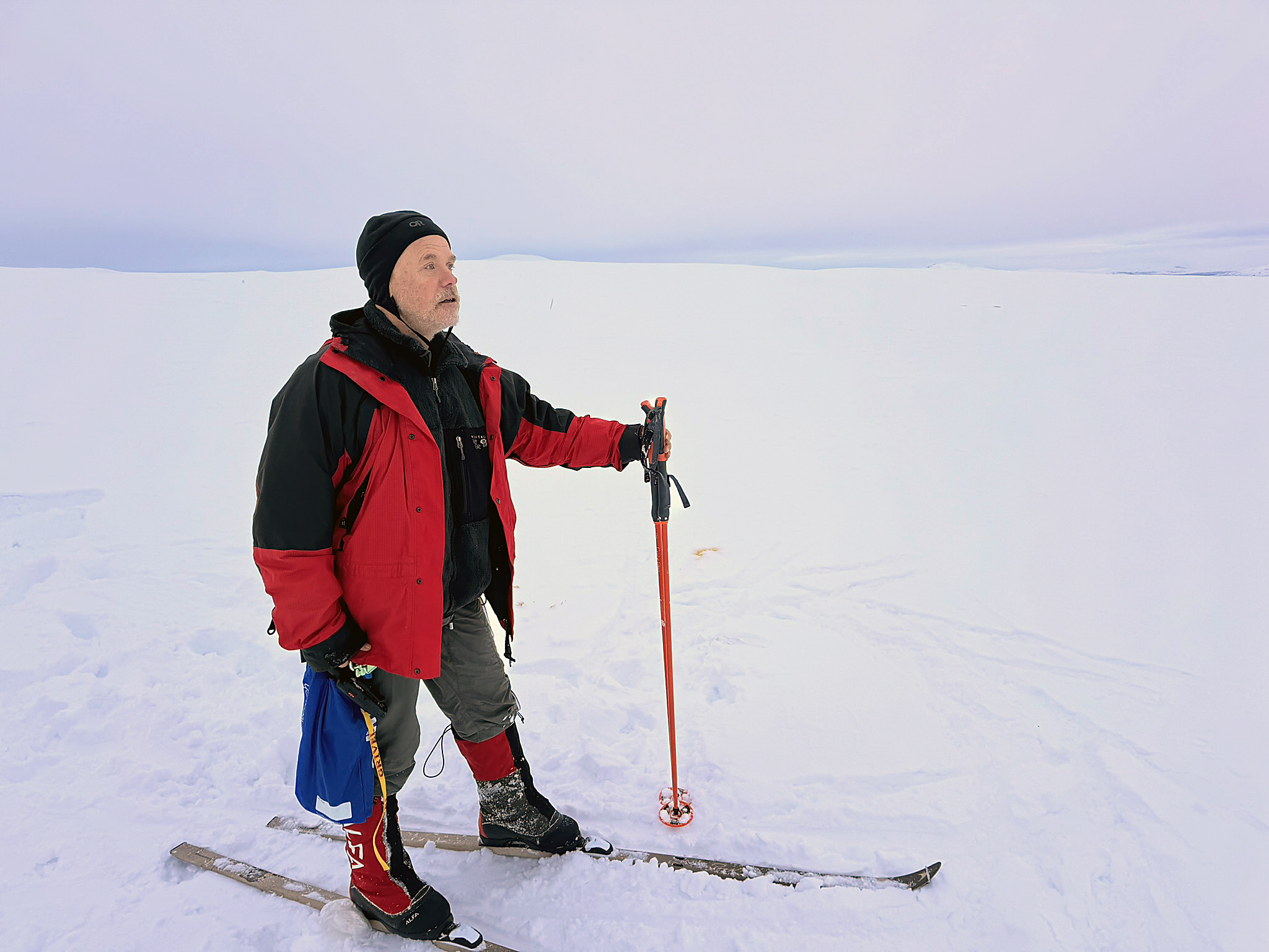 Next day was overcast, a bit warmer, but good visibility and very little wind, though it had been a bit windy in the night with windbursts to 12 m/s. We had been on long skins on the skis, so we started to climb easily. Max decided to go straight for what he thought was the peak and once up on the top, he see me continuing south in the valley below him and yelled and asked if he hadn´t made it to the peak. I pointed south. Still a kilometer to go.
