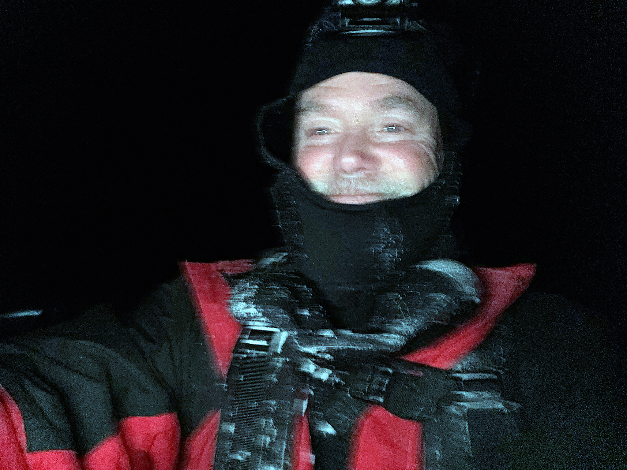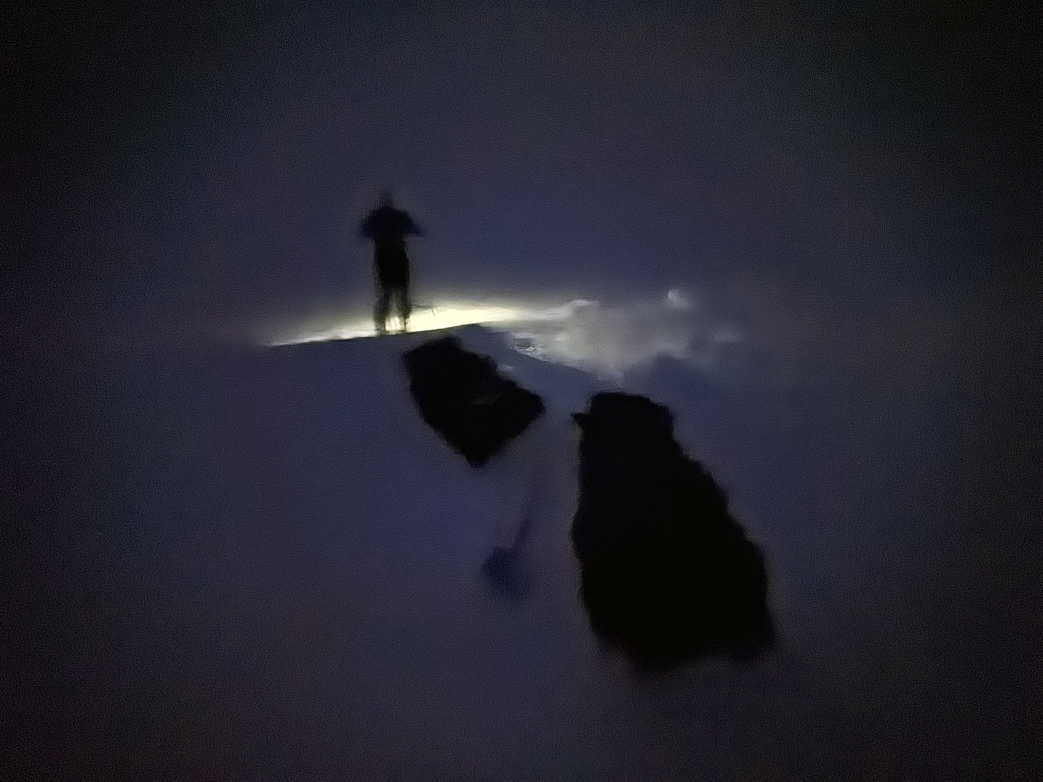 It was a bit windy, 8 m/s, snow covered the entrance, but it was the normal south westerly, warmish and snowy. My thought was to just head directly against the wind which as normal would have taken us directly back to camp, but all my scary stories about going through the ice going to the North Pole, attacking polar bears, and other horrible Arctic disasters and other unnecessary stories caused a bit of worry for a young fella who came strait from Manhattan. Now the open rivers are no deeper than the knees, but in the dark they can come across as worse. But Max asked: