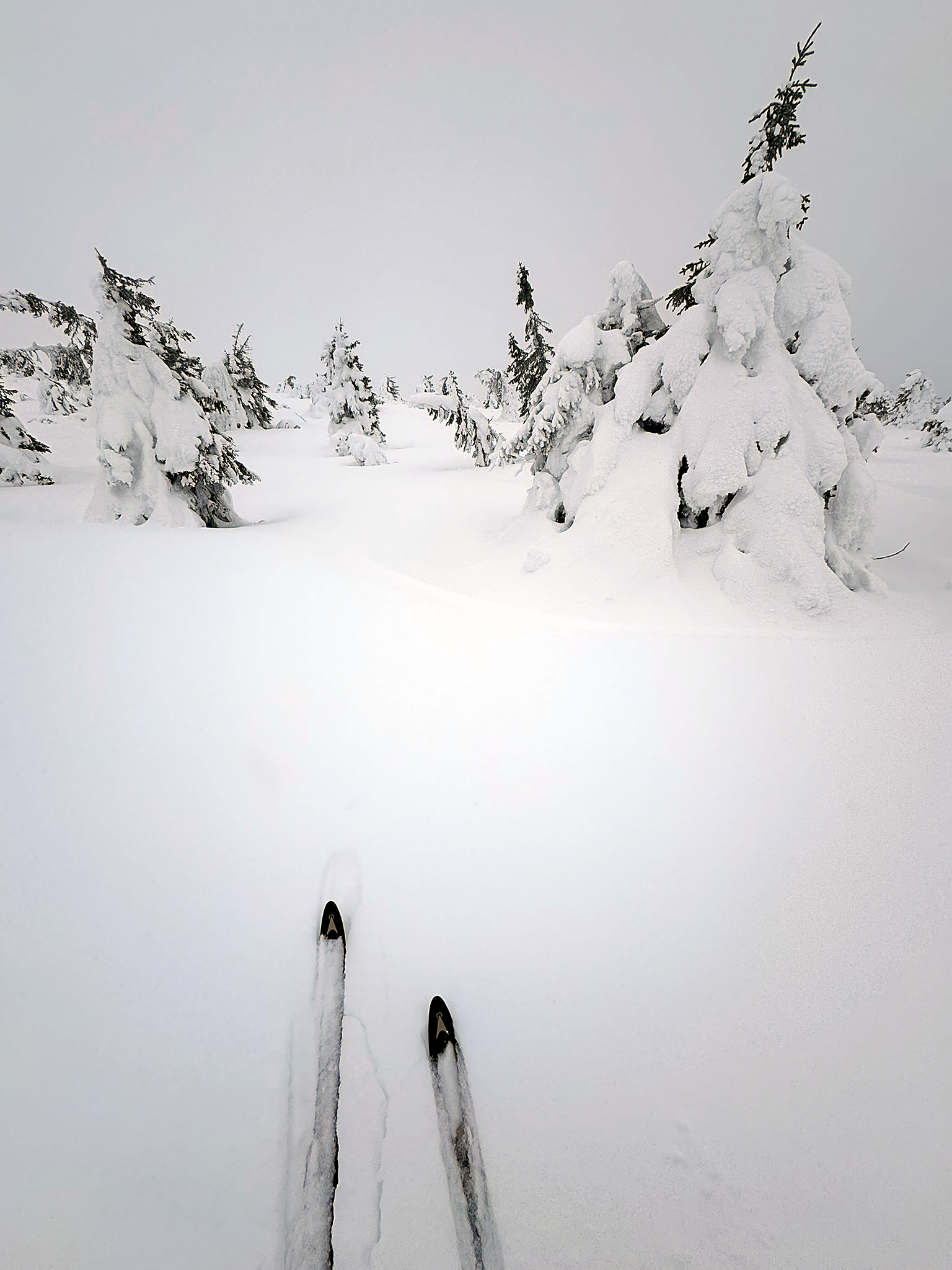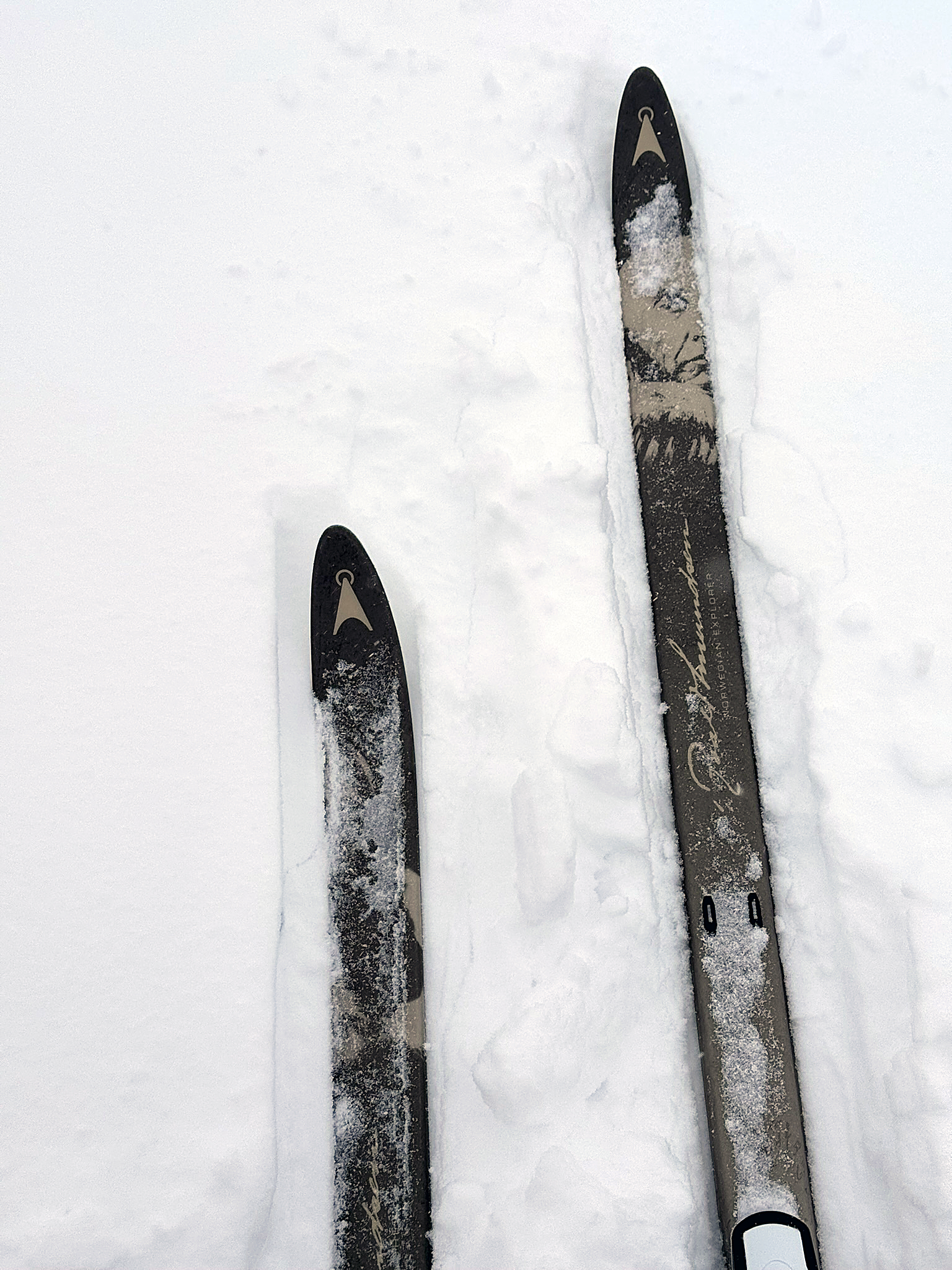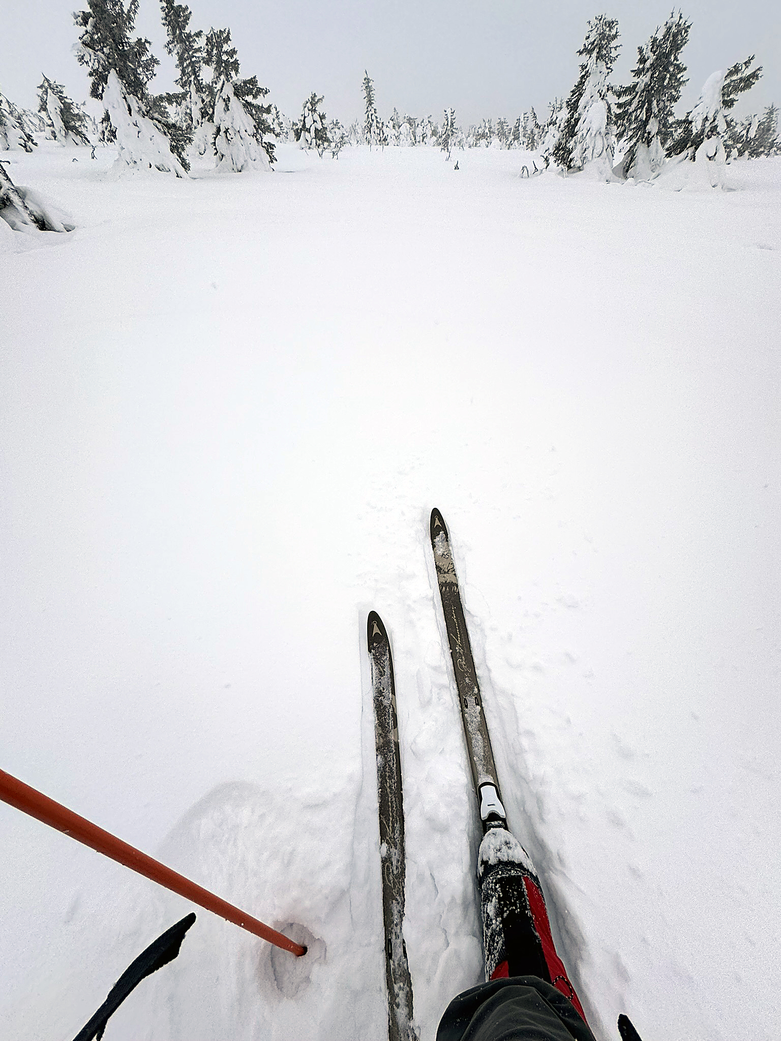 Efter en timme i skogen och djupsnön, såg jag ett slädhundekipage köra förbi och ledmarkeringarna dök upp. På avstånd hörde jag, och luktade mig till, bråkiga skotrar. En familj kom skidande i full fart för att hitta tillbaka till bilen eller stugan innan mörkrets inbrott. Jag korsade leden och åkte ut på en vacker myr och följde den tillbaka till parkeringen. En riktig höjdardag jag önskar alla människor att få uppleva! Bryt mönster!