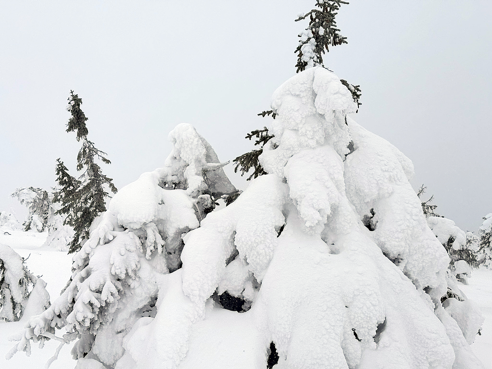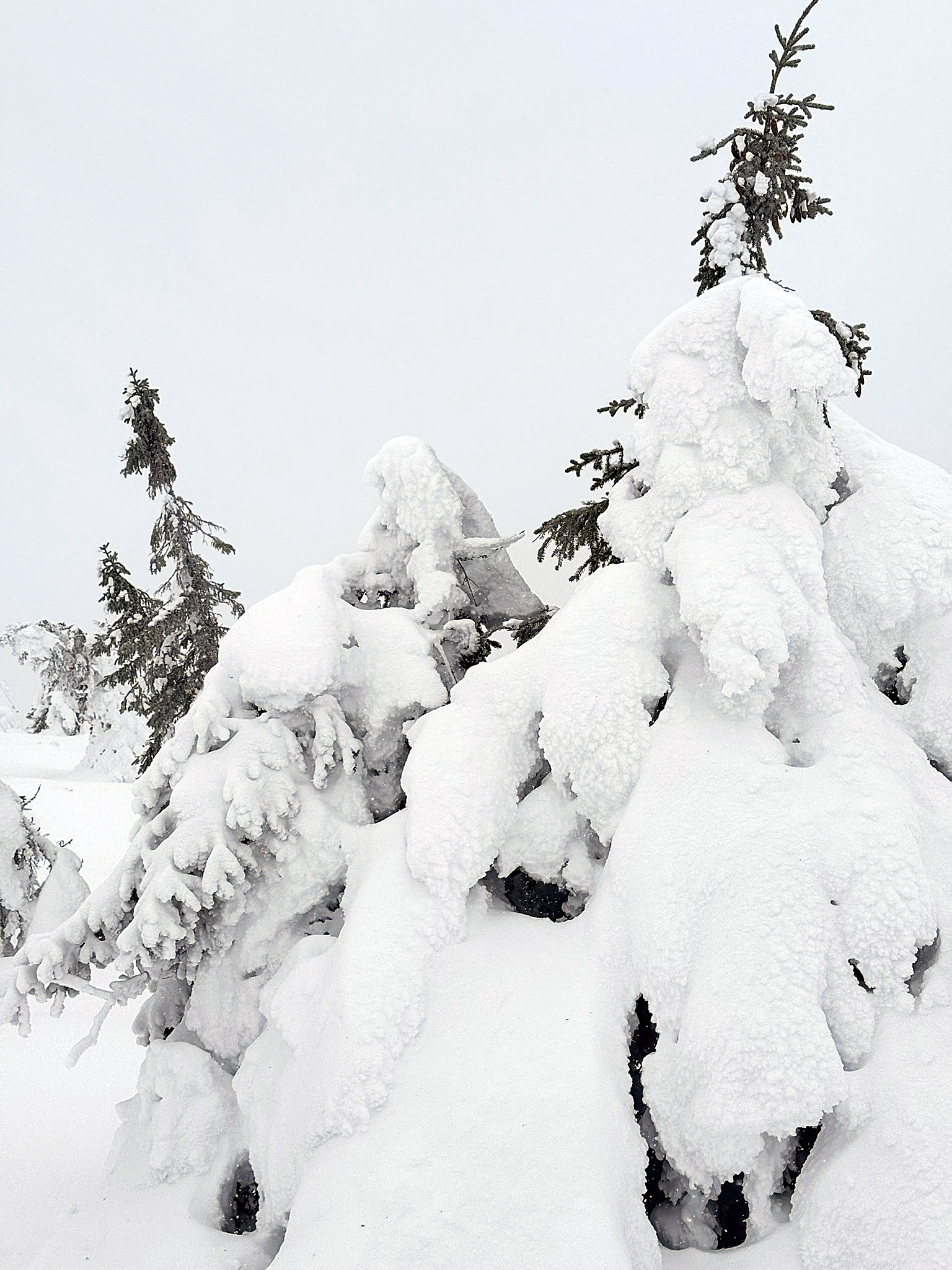 Det är en underbar känsla att lämna den utsatta arktiska platån och skida ned i den fjällnära skogen med sina krokiga träd och ståtliga granar. Det är som en oas.