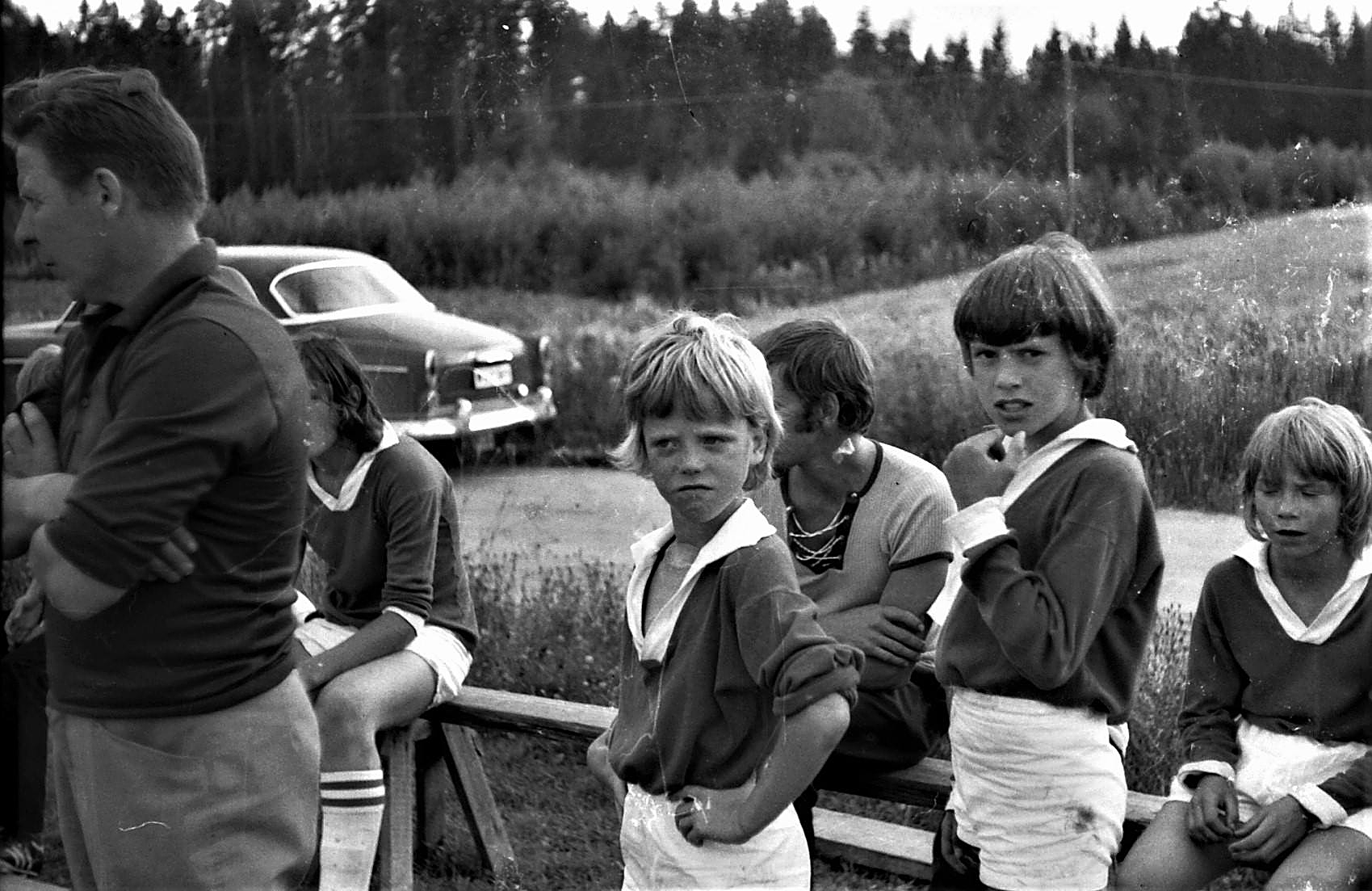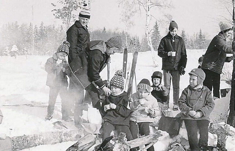 Det är jag längst till vänster. Bakom min gamle slöjdlärare Ragnar Morling, alltid snäll och uppmuntrande mot mig. Det är skidskola. Min gamle lekkamrat med massor av spektakulära upptåg, aldrig tråkigt i hans umgänge, Per Tongring, som sitter tillsammans med släkting Patrik framför elden. Med stor sannolikhet dricker vi alla choklad. Jag lärde mig aldrig åka skidor. Parvel rännet var alltid en katastrof för min del. Även då var det vallnings problem. Träskidor, farsan lade på tjära. Det gav totalt fäste. Tvärnit redan i starten. Jag minns jag stod och grät i någon backe när alla åkte förbi mig. Men jag kämpade på under upploppet eftersom det var mycket folk där som glatt hejade på alla. Förmodligen var det mest så att jag inte var någon skidåkare. Märkligt nog är ju mycket av min tid nu, skidåkning. Mest att jag går på skidorna. Och drar en pulka. Men med tanke på Vasaloppet, där jag var övertygad att jag lätt skulle köra på en 5-6 timmar, men även där blev frånåkt av folk -bland annat en över 80 år gammal veteran- så har jag alltid varit duktig på att överskatta min förmåga att ta mig fram. Men på samma sätt som under Pavel loppet lade jag mest kraft på upploppet.