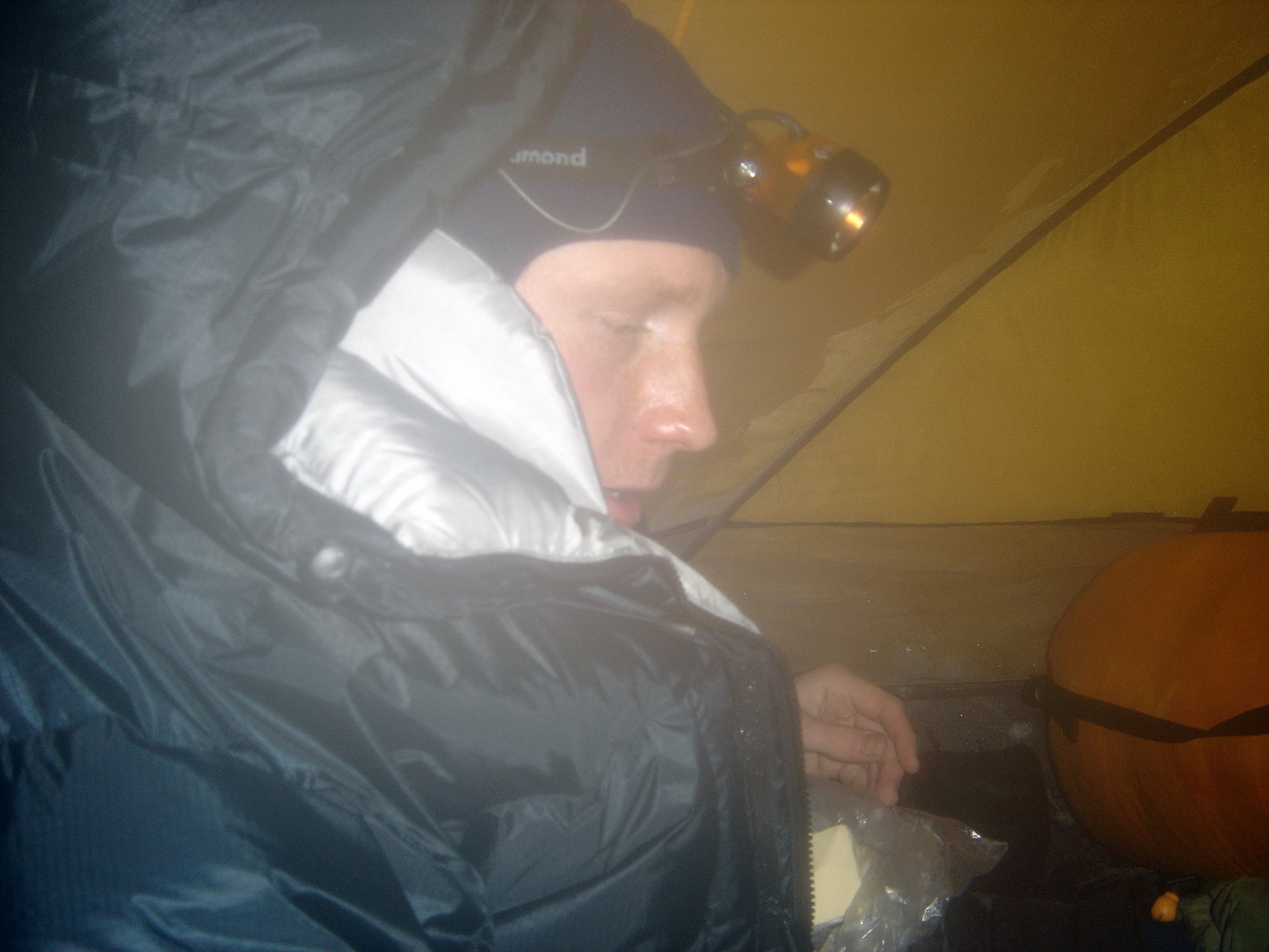 Snowing and overcast, almost complete whiteout. We’ve passed the half way mark now. According to plan. And we’ve also reached the first stage of feeling utterly run down. Also expected. I’ve experienced this nasty fatigue on all of my Expeditions. This moment when all energy- and fat