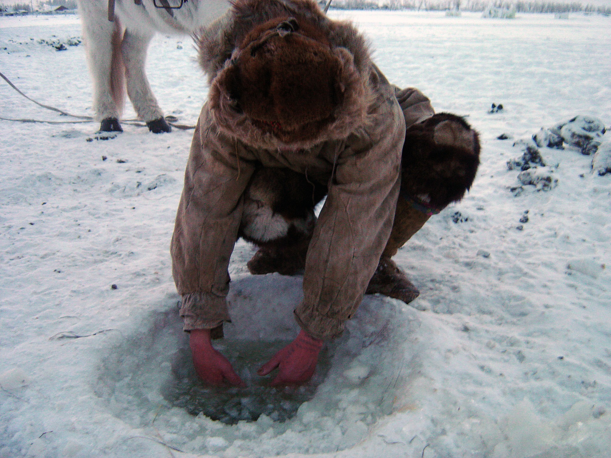 Five other Yakut horses trots cautiously our way. They don’t like our hurried movements, our camera flashes and stops. But finally they make their way to the watering hole. Even the tame horses walk freely around the village as they like. Well, at least normally. This winter, however, a big herd of wild caribou have made their way down from the barren tundra in the north to feed in the taiga of this area. And big packs of the giant polar wolves have followed their tracks.