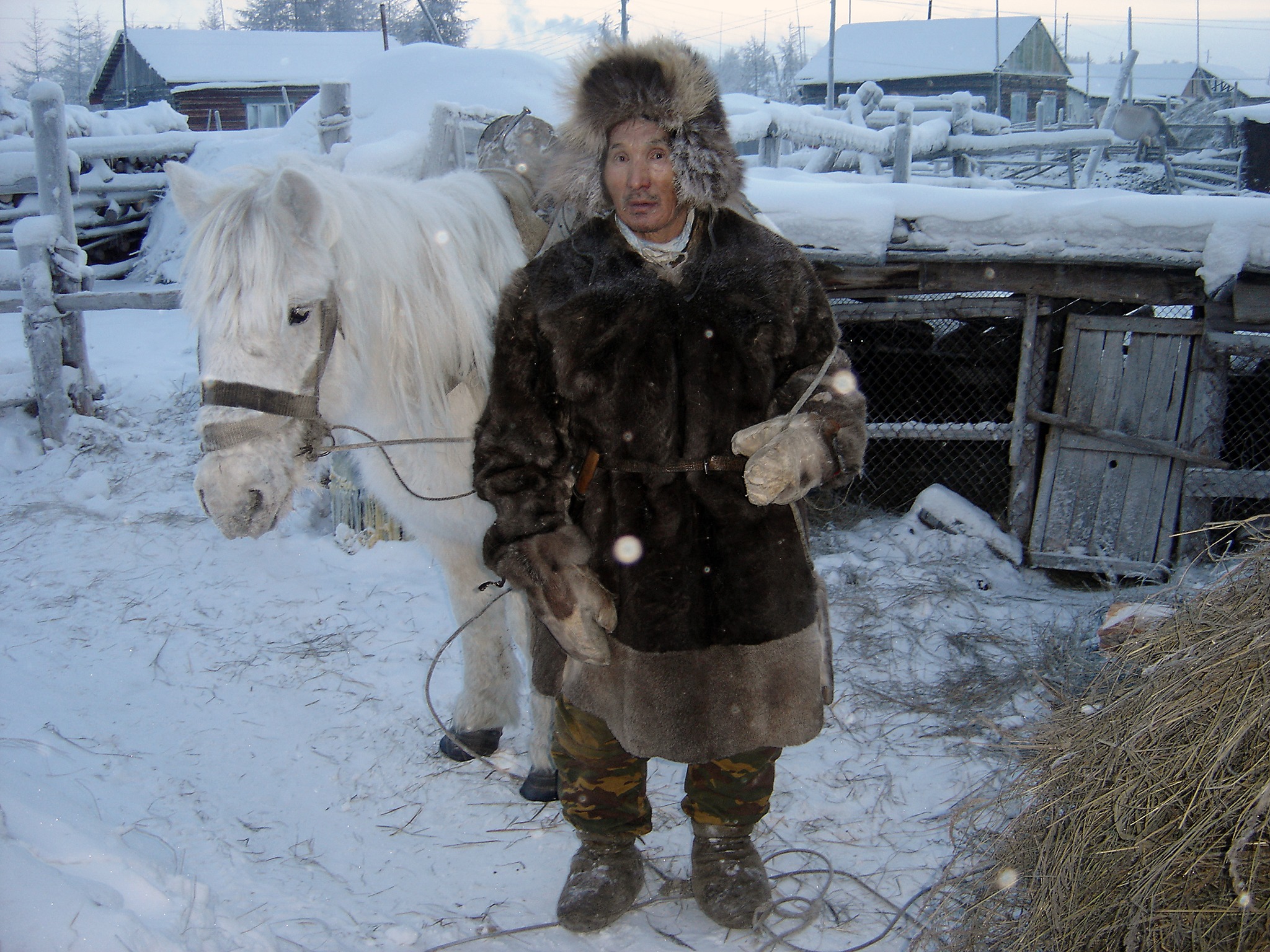 Most locals use the horse every day. Either when they ride down to the nearby lake to fetch ice to make drinking water from, since there’s no running water during the winter season. Or to fetch hay, timber or any other essentials for their daily survival. They don’t walk next to the horses or sit at the back of a sledge and steer, no, the Yakuts always ride their horses. They’re very proud over their own history and ability to handle horses. Vasili is a symbol for this reality and when he sits up on his horse, it’s hard to believe he’s 75 years of age, he swings himself up into the saddle. At least the first time. The next one, he climbs up on a haystack and takes place in the saddle. His horse wasn’t in the mood for tricks today. This irritated horse apart, most Yakut horses are very relaxed, easy going and calm.