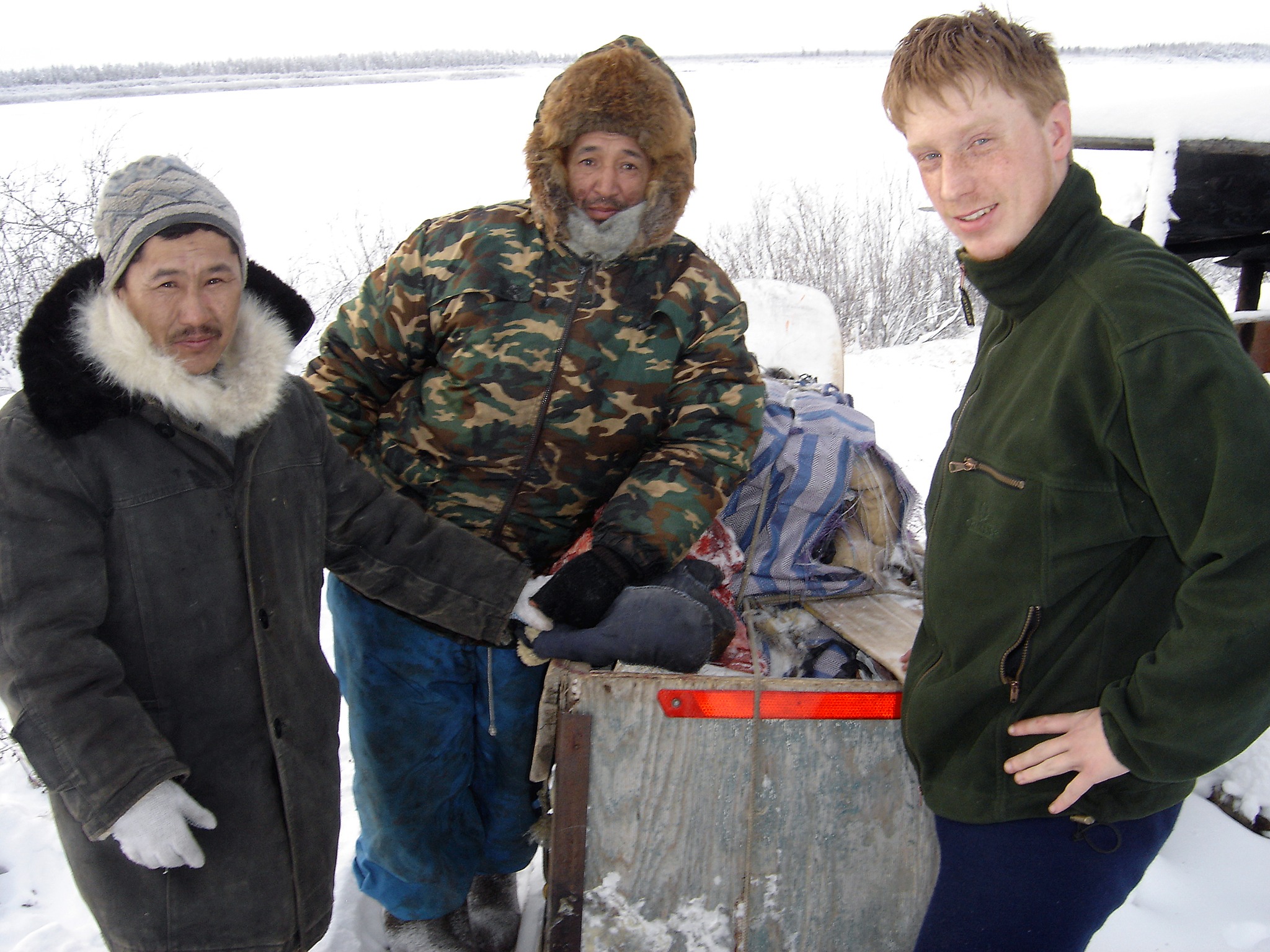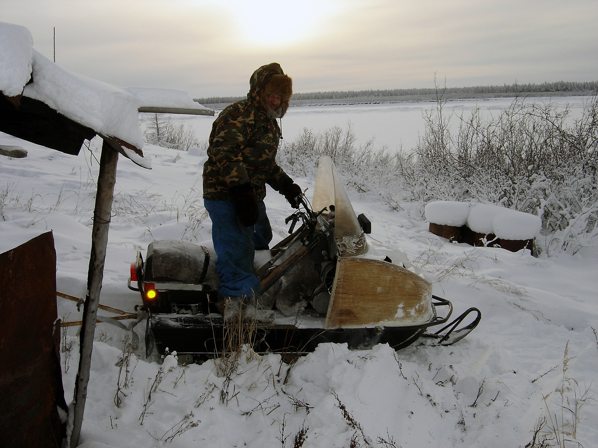 We expected to leave today. But whilst preparing a trout soup yesterday evening, a buran (snowmobile) drew up and stopped outside the cabin. Two yakut hunters, on their way
