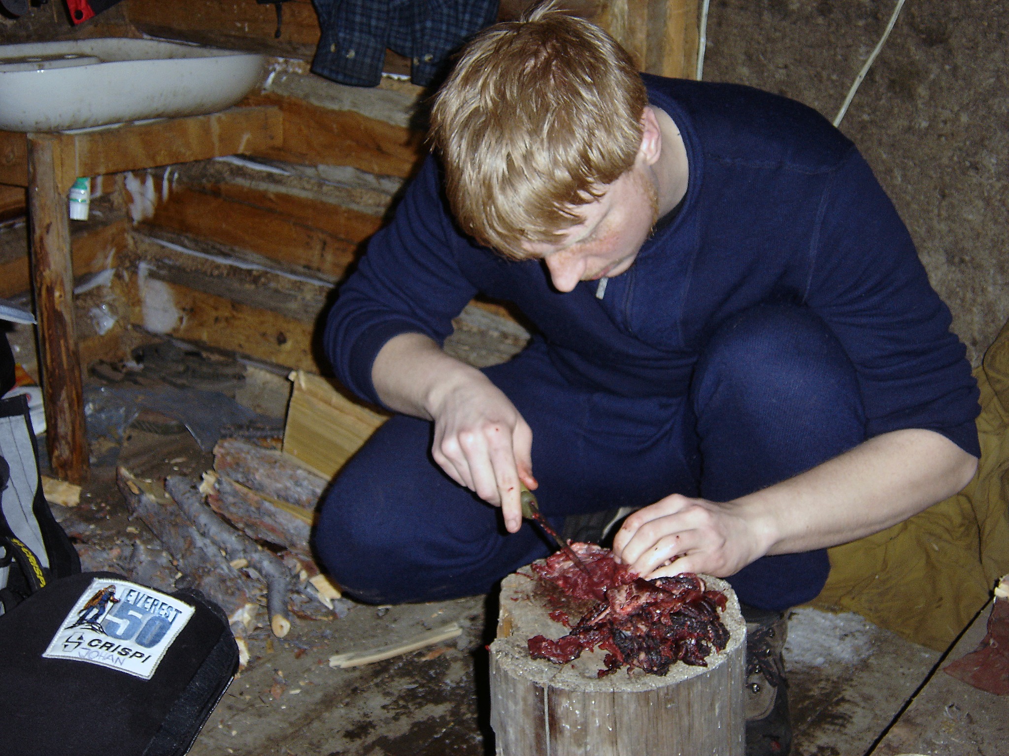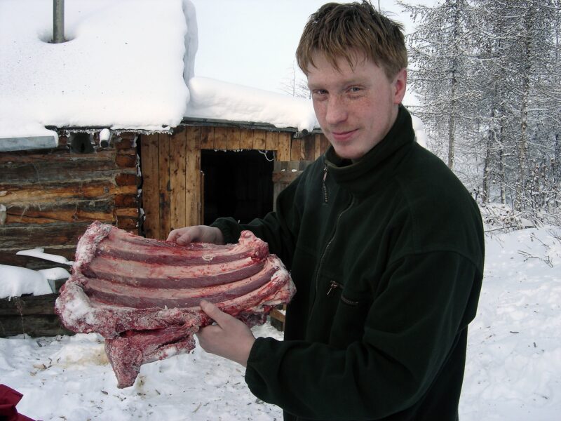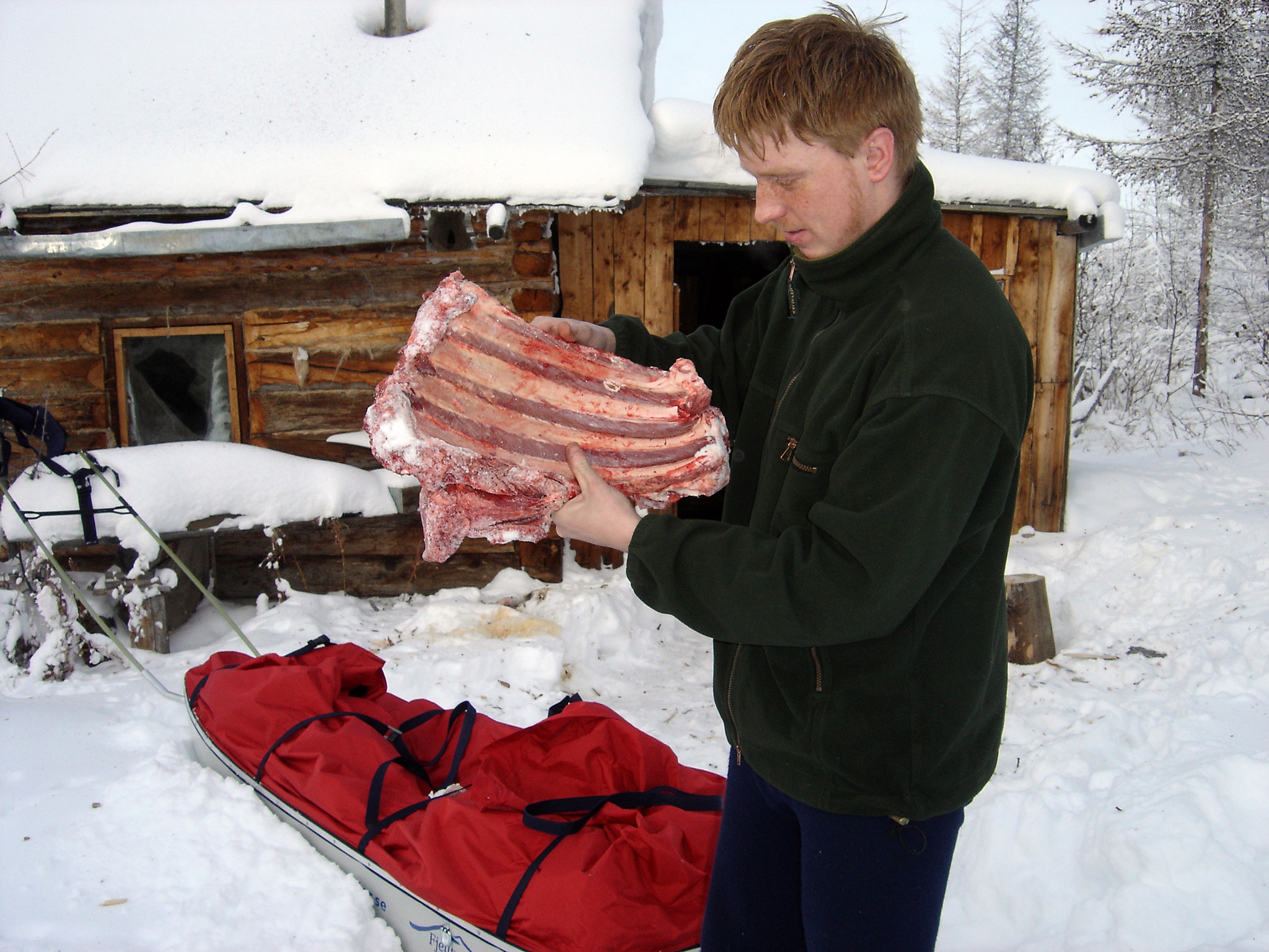 back to their nearby cabin after a hunting trip in the mountains, rushed into the cabin. They both had, what we would consider as severe frostbites, due to a long time without warmth and some parts of their cheeks had turned black, but this is normal for them and nothing that seems to bother a Siberian. (As it does with Mikael, who’s cheek is turning black, but not swollen right now) They probably were as surprised as we were in meeting other people out here in the middle of nowhere. But they were happy to be able to warm up a bit before continuing across the Kolyma towards their cabin. Before they left, they gave us another proof of what incredible people that live out here, when they handed over a 5 kilo heavy piece of moose ribs. They never cease to amaze me!