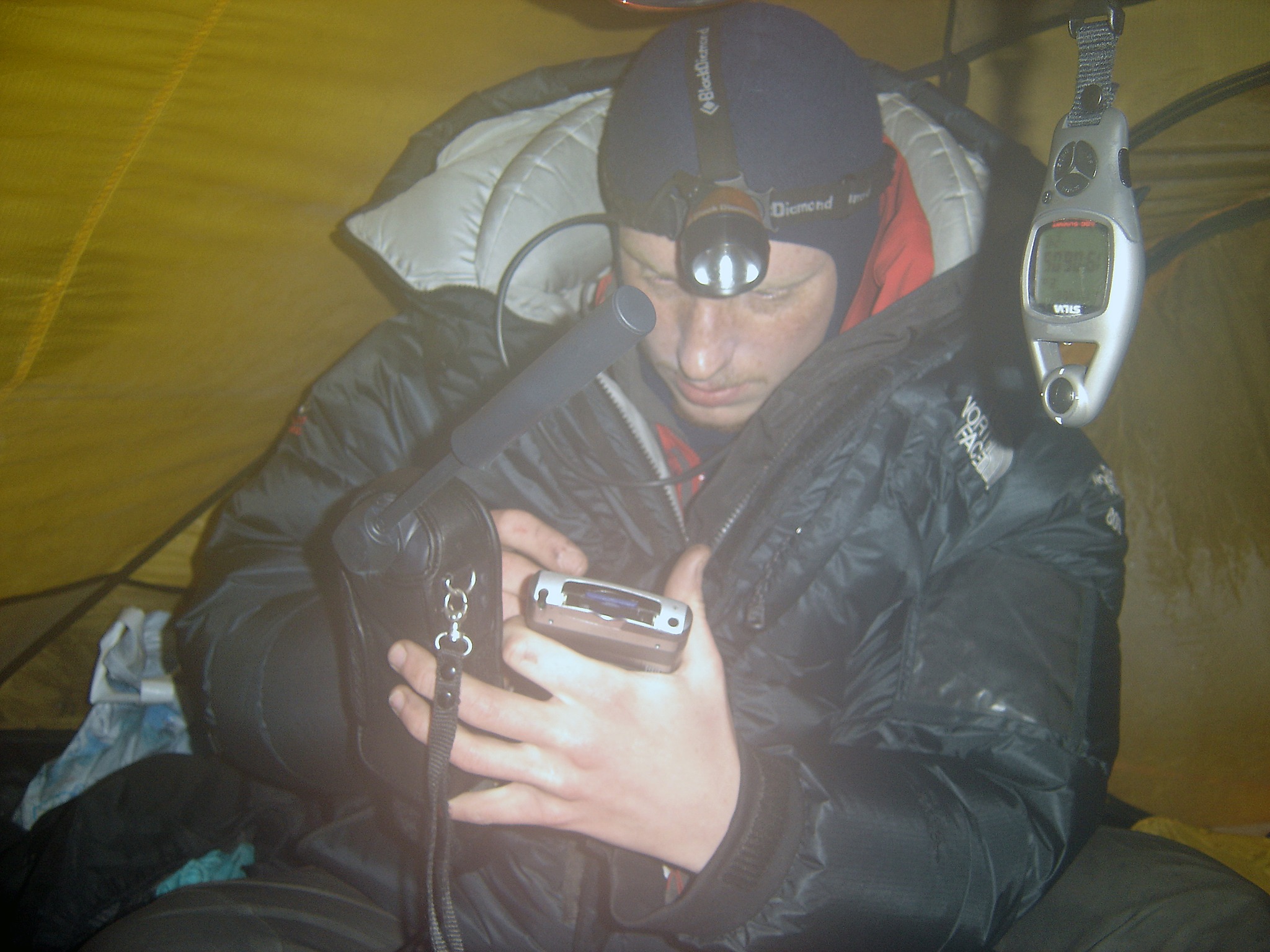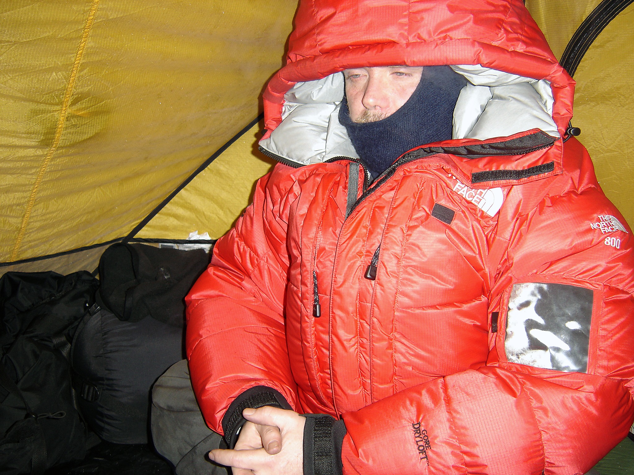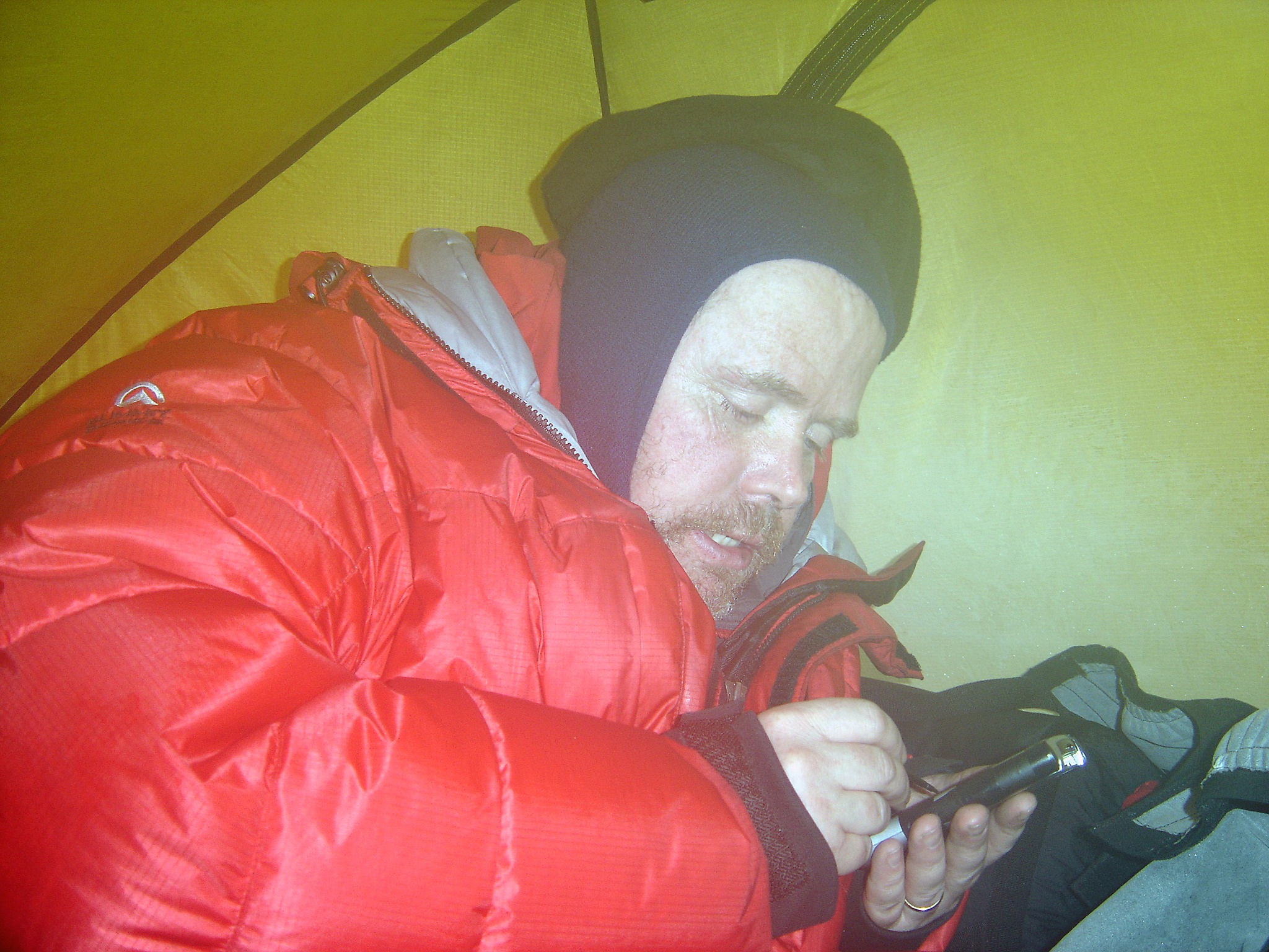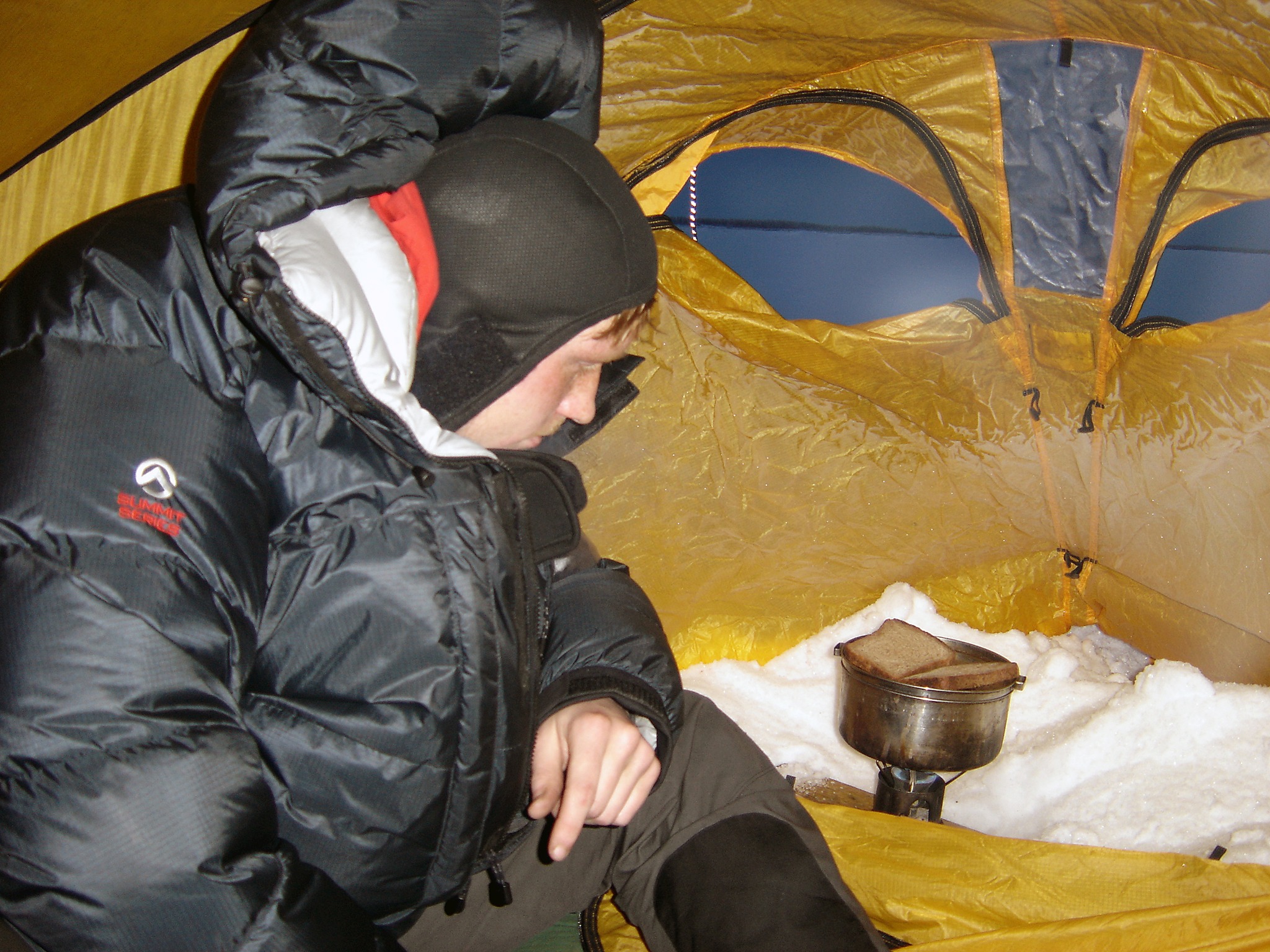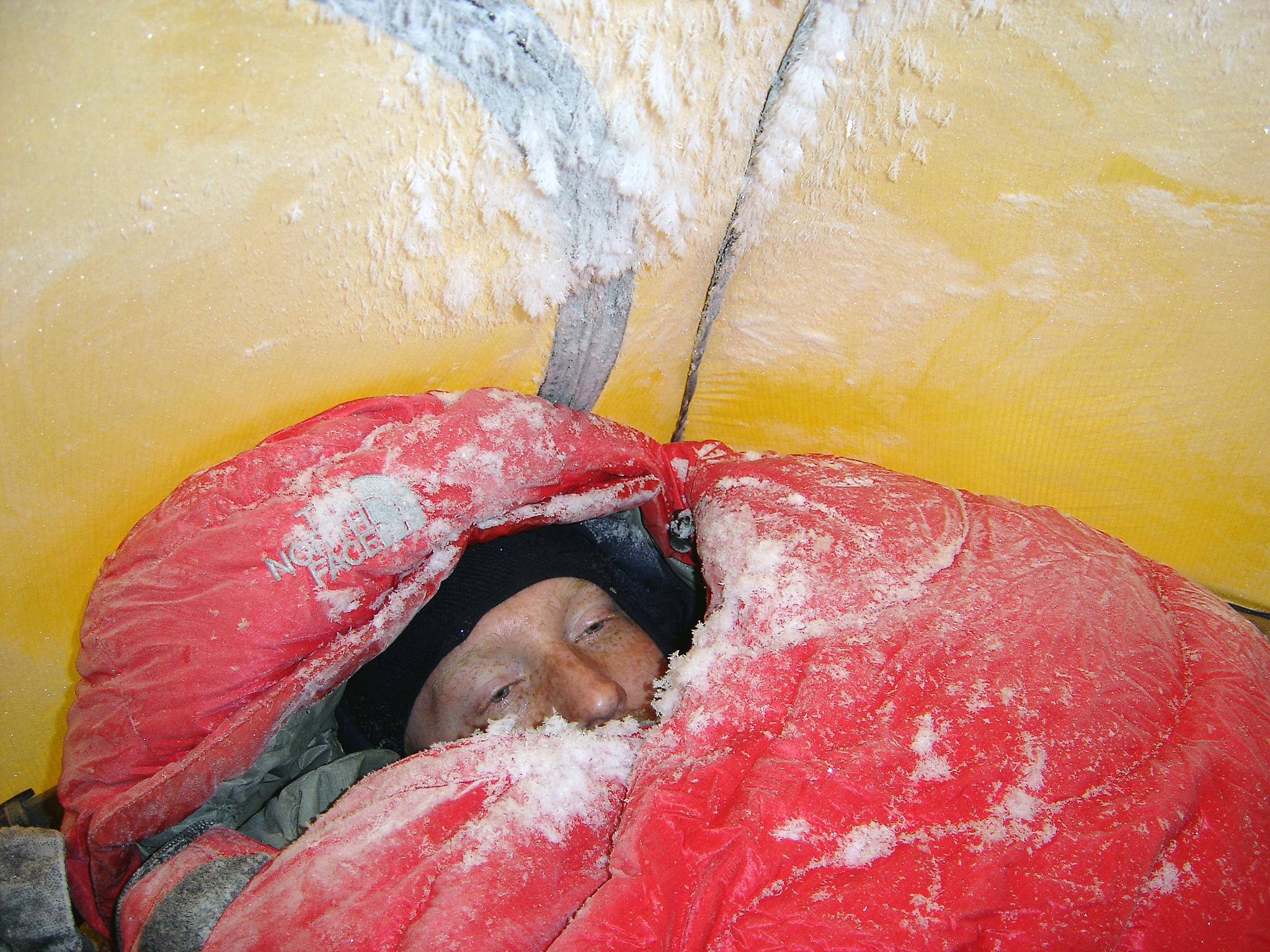 We eat a bag of freeze dried, drink a couple of mugs of coffee together with a couple of sandwiches, before we slowly, not in panic as it was during mid-winter, strip down and creep into the sleepingbags. Together with our wet gloves, balaclavas and socks. It than takes an hour to work up sufficient heat and comfort to be able to sleep. We sleep extremely well in this fresh air. (Temperatures below -44°F are not fresh and healthy!) We slept 11 hours the past night.