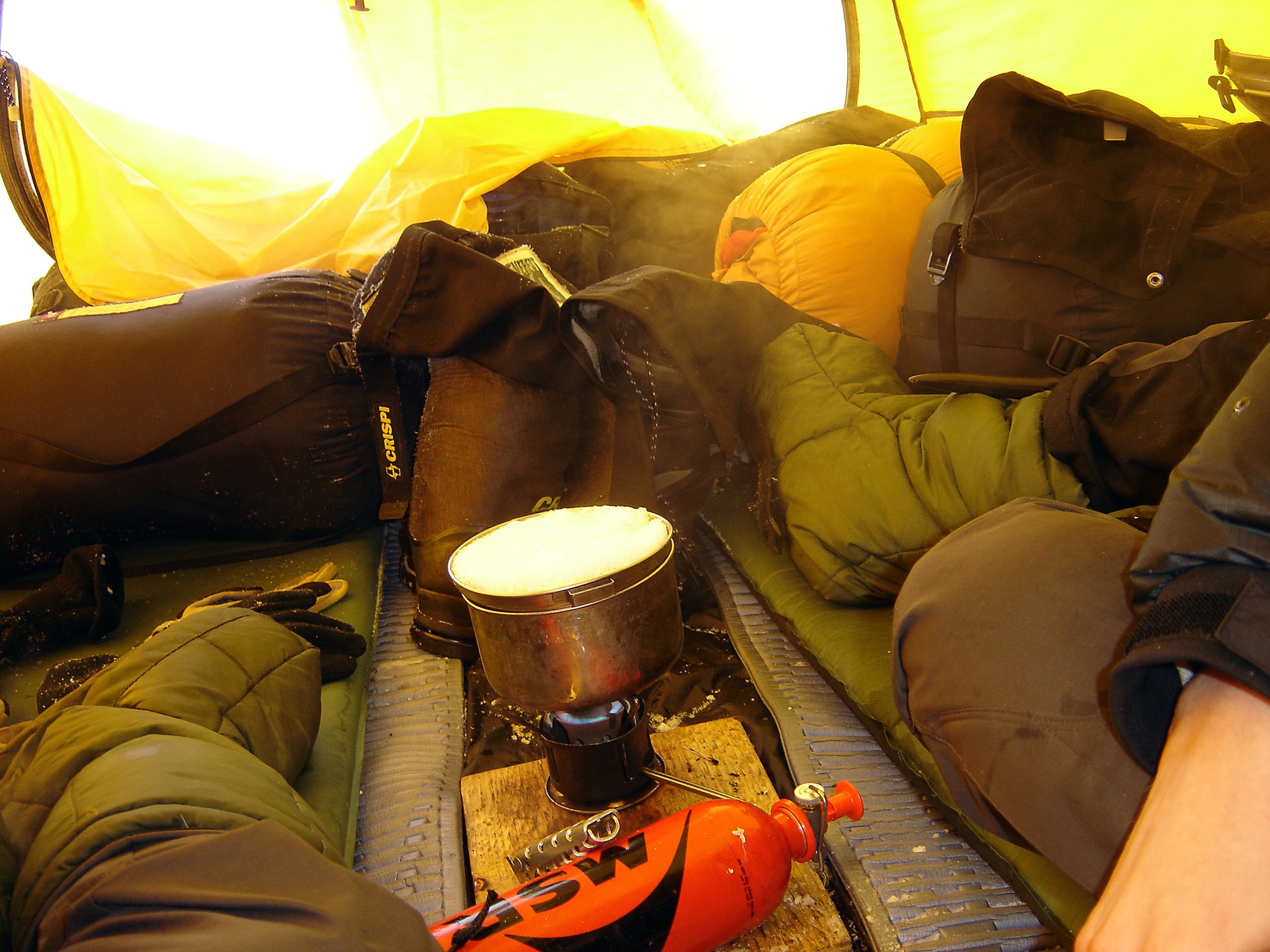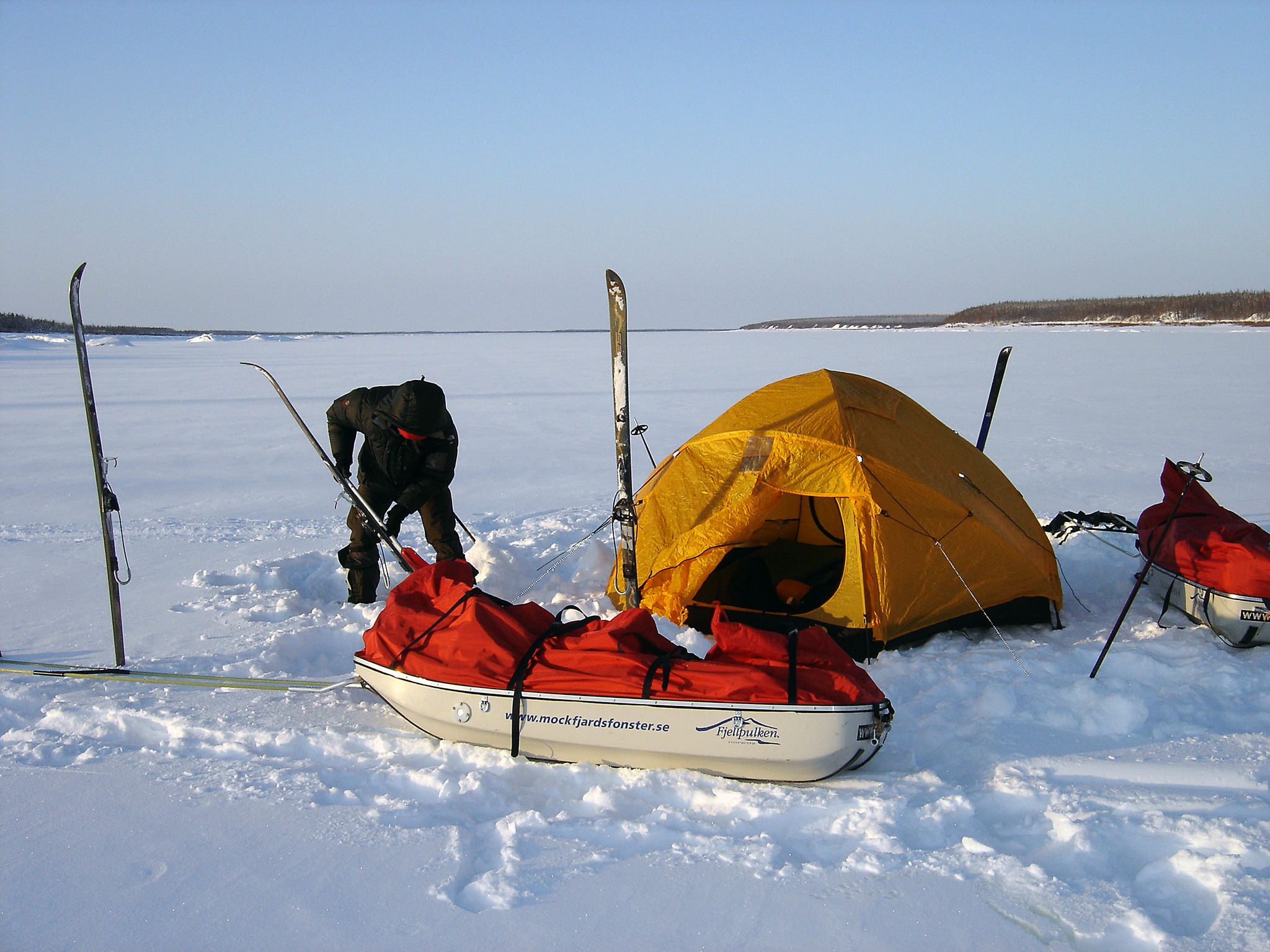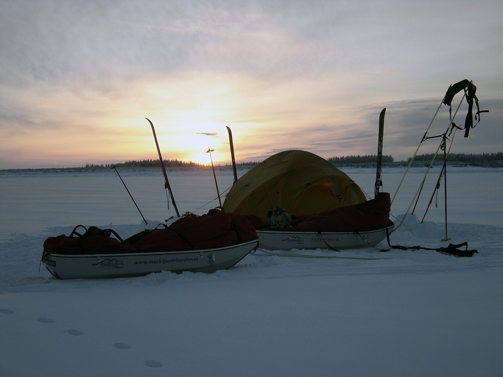 Finally, camping is once again beginning to feel comfortable and neat. Naturally due to that the climate is warming up and due to the many hours of daylight. If you compare camping today with that during Mid Winter, this is a relaxing holiday. At that time we had severe problems sleeping at all, with ice thawing off the spine the first couple of hours inside the sleeping bag, and it was terrifyingly cold day and night. Gee, if we’ve caught a cold during that period, I doubt we would have survived. At the moment -40°F feels comfortable, -22°F much more so! (By the way, there’s a major difference between – 40°F and -58°F. Much bigger than between -22°F and -40°F) At the present we’re already warm and dry even before entering inside the tent and once the stove worked up some warmth.