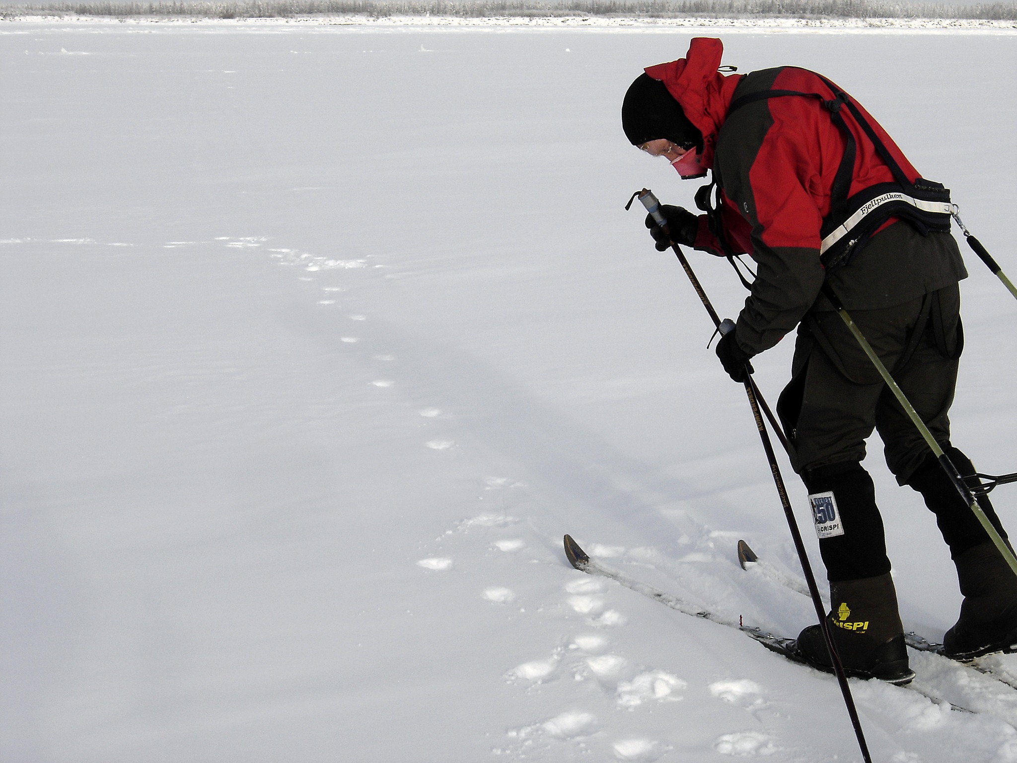 It’s been a gray day, -22°F plagued by a 3-4 m/s southerly and we’ve basically followed a fresh wolf track all day and we’ve done 27 km:s during two days.