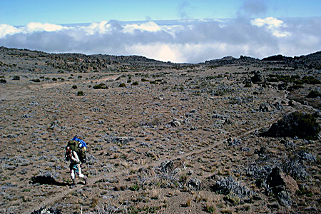 Om första dagens mycket försiktiga traskande förde oss genom enstaka bitar av tät regnskog och alltför många hyggen, så präglades hela den andra dagen av att vi passerade uppåt genom ett stort hedlandskap dominerat av meterhög ljung och enstaka träd täckta av stora mängder trolsk skägglav. Eftersom jag redan hade bestigit Kilimanjaro elva år bakåt i tiden, visste jag att ju saktare vi gick, desto bättre acklimatiserade vi oss med den höga höjden. Det klart övervägande hindret för att nå toppen, Uhuru Peak, på 5895 meters höjd.