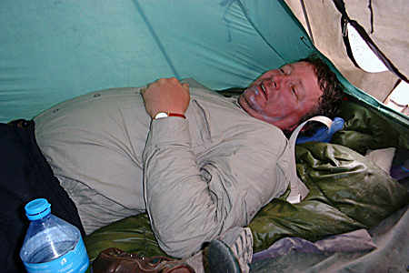 Jag somnade direkt huvudvärken försvann och vaknade först av att jag hörde någon i granntältet ropa klagande ut i det kalla nattmörkret.