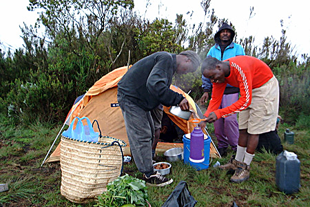 Den gången för elva år sedan hade jag cyklat fram till Marangu Gate, den tidens enda ingång till parken, parkerat cykeln hos en parkvakt, betalat 125 dollar i olika parkavgifter, burit min egen ryggsäck, eget kök och mat, tält och liggunderlag, hängt på en grupp hyggliga tyskar med guide, en sådan behövde man redan då enligt lagen, och tillsammans med en vän från Äppelbo med enkelhet bestigit högsta toppen på fyra dagar. Den gången fanns det få regler och inga komplikationer. Den här gången planerade vi en sex dagars tur, för att så mycket tid som möjligt att acklimatisera oss på.