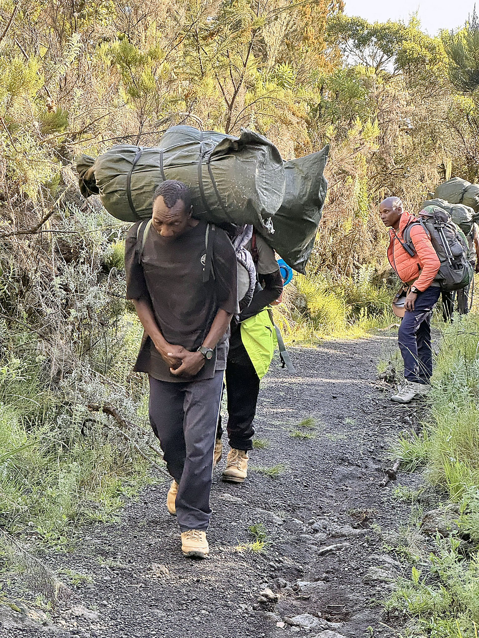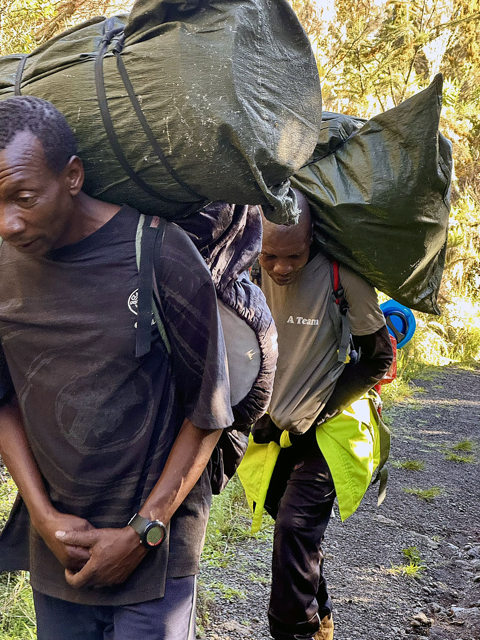 MJ had had the same difficult night. Norm and me slept great. 8 hours plus. Moses and the A-Team as they called themselves, slept ok, but nothing great. It wasn´t altitude that was the problem for them, they had done the same trip two weeks earlier and where acclimatized. But it was all suddenly very hard work. And except Moses, they all slept in a big tent. This season, the monsoon season, wasn’t the easiest time to find people who wanted to do this job, because it was considered very cold, due to rain at lower altitudes and snow at higher ones. They carried their stuff -15 kgs per person- on their heads, if it wasn´t a rucksack, African style, not like the Sherpas of Nepal who have a headband.