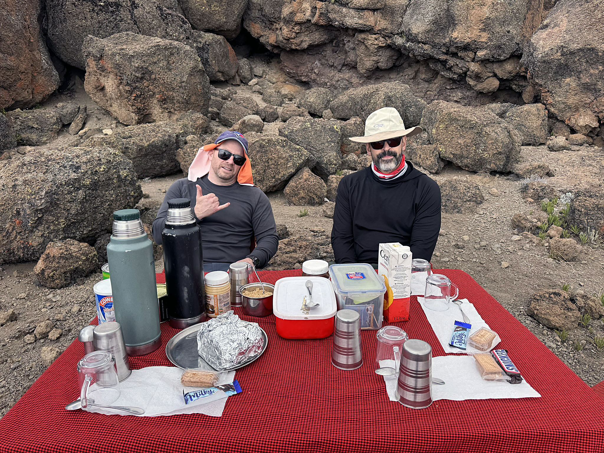 The plan for the day was an easy walk, with just slowly putting one foot in front of the other, for some time to make it to camp 2, called Cave 2. Located at 3452 meters. So only about 780 altitude meters to gain and it took us only 1½ hour to walk the 5.5 km. Ten minutes from Camp the team had set up a table, with a table cloth and chairs. Cookies, great Africa instant coffee, juice and cakes. And, more important, great weather, sunny offering superb views of my favorite mountain, Mawenzi. Kilimanjaro was growing smaller in our sight, but had more snow covering the volcano, than I had ever seen before. It was beautiful and we had now left the moorland for rocky alpine terrain. But no wind, lots of fresh air and a strong sun. The weather had worried me, because this was the monsoon season with lots of heavy rains, but nothing so far. And good weather makes a huge difference. So does the company. A new personality had appeared in the shape of Ishmael, or Suma-Ji as his friends called him. He had so much natural joy, laughter, charisma and he was always full of songs, encouraging words. Encouraging singing, joy and words would be a major part of this great experience!