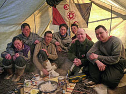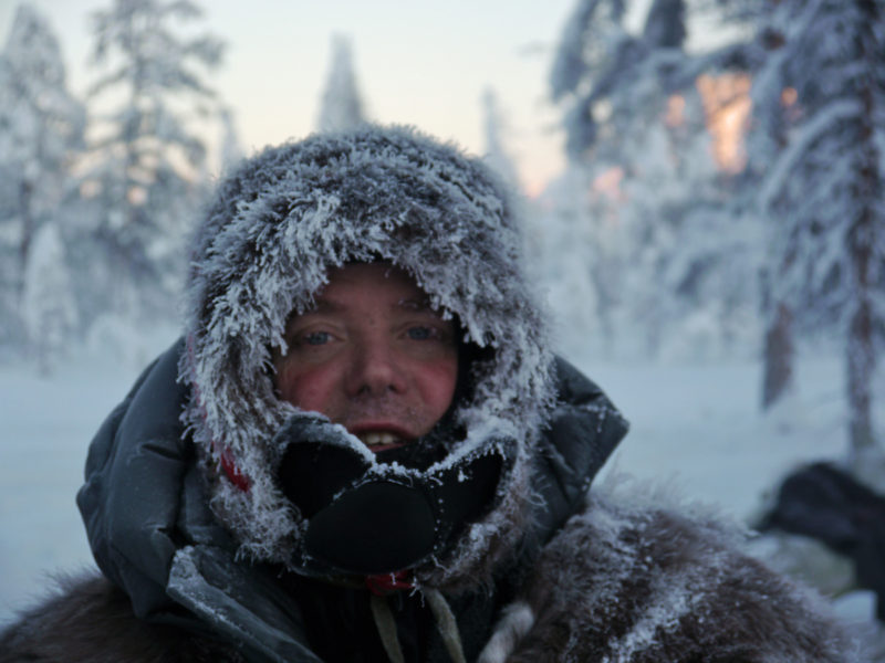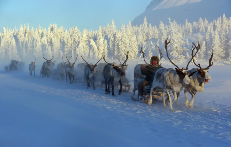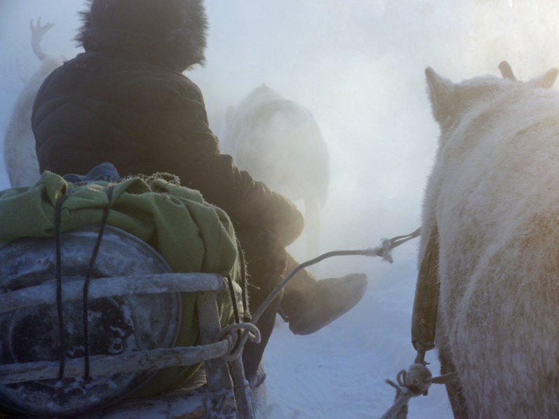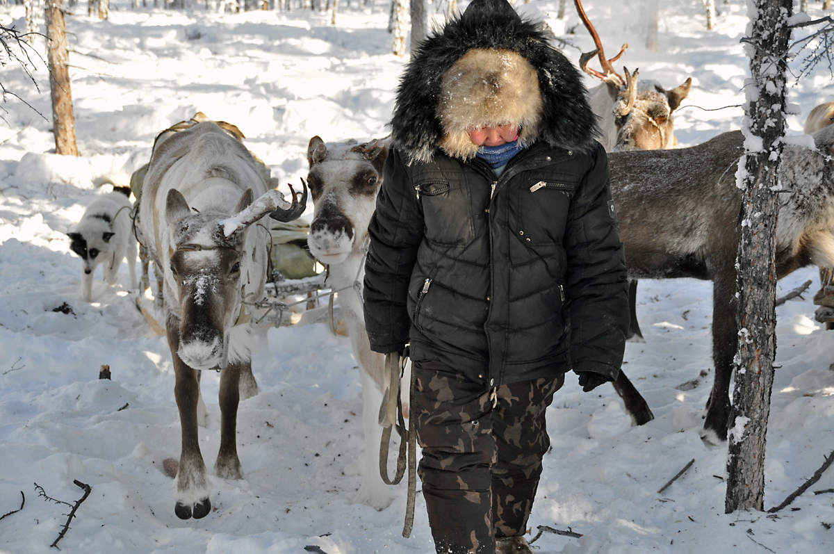 Renskötarna, som kommer från byn Arkah—ett av de sista stoppen på vår rutt—hade väntat i Uchugaj i två månader på vår ankomst. Den genomsnittliga vintertemperaturen här är −35 °C, men den sjunker ofta under −60 °C, som den gjort i flera veckor, vilket gör det svårt för renarna att beta. Permafrosten är mer än en kilometer djup och större delen av året är dagsljuset inte mer än ett svagt sken vid middagstimmen över horisonten, medan vinande vindar på över 90 km/h drar fram över snölandskapet.