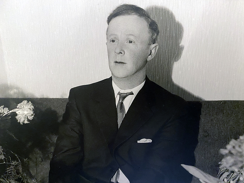 Jag hittade den här bilden på honom på vinden. Taget hemma i Liljas Hol i Dala-Järna. Taget i det s.k finrummet. Alltid kallt, eftersom vi sparade elkostnader genom att slå av värmen här. Obekväma möbler. Mattorna på golvet likaså. Det var här man bjöd besökare på kaffe och hemgjorda kanelbullar. Och ett antal varianter av smördegskakor. Och det var i finrummet man satte på sig kostym för att få ett studiofoto taget. Det märks att farsan var ovan att ha kostymen på. Han har glömt knappen längst ned. Slipsknuten är inget mästerverk. Han var nog mer hemma i murarkläder. Faktiskt är nästan alla mina minnen från honom att han endera klippte gräset hemma, murade eller donade på gården. Eller drog iväg i den där röda Saaben för att hälsa på kompisar. Och ta sig en öl. Farsan var duktig att rita och måla. Kurbits. Han läste också lyrik. Efter hans plötsliga död i 1973 hittade jag Fänrik Ståls Sägner på nattduksbordet. En skrift som hyllar nationalstaten. Skriven av den finska nationalskalden Johan Ludvig Runeberg. Jag hade också sett en bok med dikter av Nils Ferlin. En poet som gillade sena nätter och sprit.