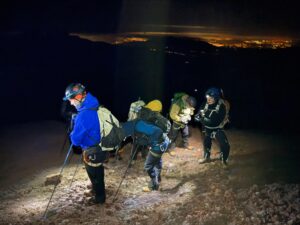 Ahead of us, the route curved around a crevasse. The rest of the team were small figures, headlamps, slow steps—skirting the edge to reach where Hannah, Maurizio and I had stopped. We were at around 5,600 meters on Cayambe (5,790 m). Only 190 meters of vertical left to the summit, but the summit was hidden, as if the mountain didn’t want to show itself to people who hadn’t earned the right to see it.